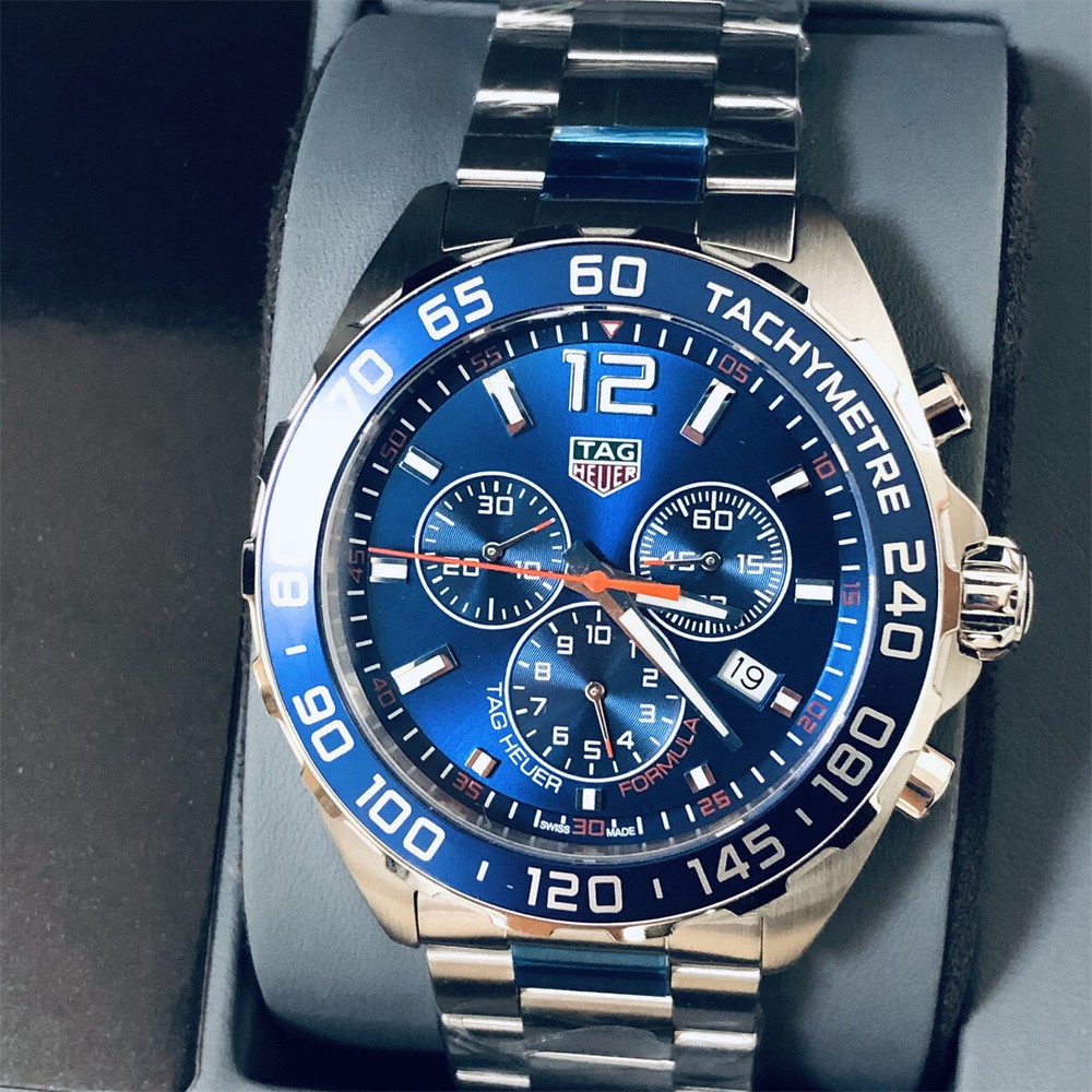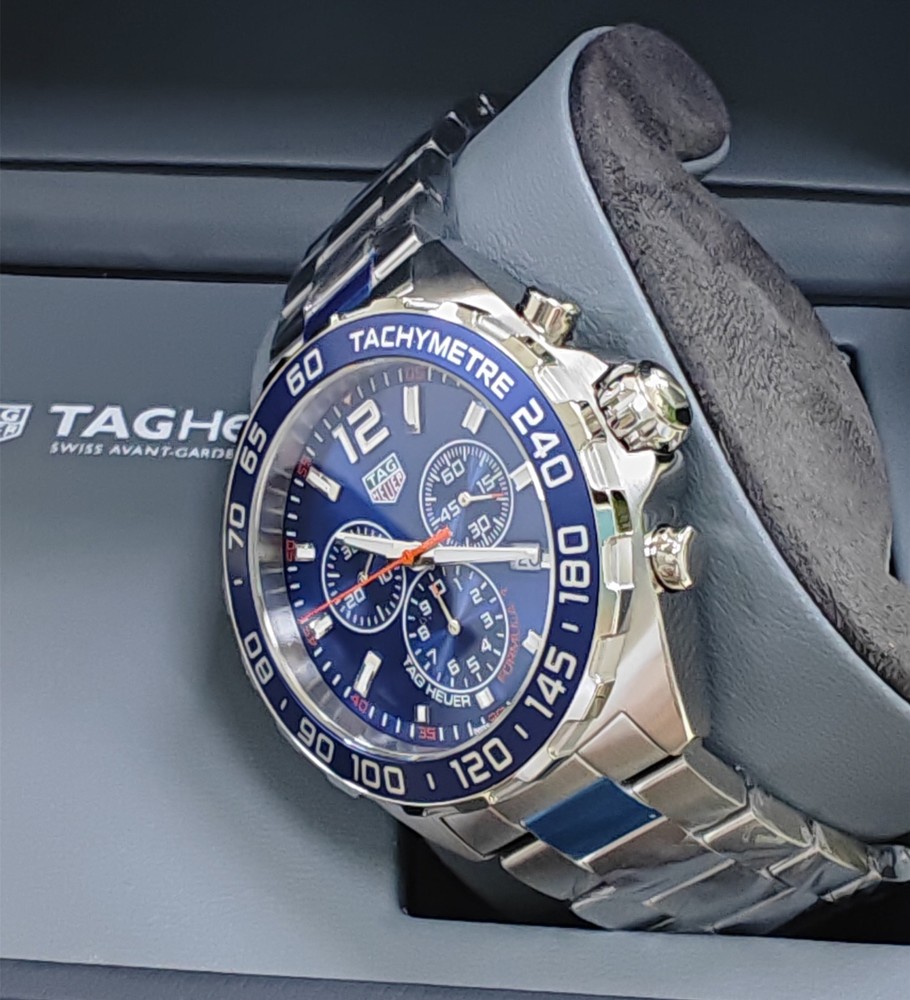 We have metal , Leather,Rubber bracelet If you need it, please contact us Product de scription The TAG Heuer Formula 1 Chronograph Stainless Steel Blue Dial Date Divers Quartz Mens Watch Model# CAZ1014.BA0842 / CAZ1014BA0842 has a blue sunray dial that is encased in the brushed and polished stainless steel case. The blue Alu Steel fixed bezel has a tachymeter scale. It features silver-tone and luminescent hands and indices hour markers, and an Arabic Numeral at the 12 o'clock position. Date display window at the 4 o'clock position and three blue sub-dials for 60 seconds, 30 minutes, and 1/10th of a second. The watch is fitted on a brushed stainless steel strap with a deployment clasp. The watch offers a water resistance capacity of up to 200 meters/660 feet. Like all of our watches, this TAG Heuer Formula 1 Chronograph Stainless Steel Blue Dial Date Divers Quartz Mens Watch is brand new and comes in its original packaging. Edouard Heuer started the TAG Heuer company in 1860. This is today a brand that is in a league of its own. As a sports watch worn by the most famous of celebrities, it is the dream watch for many people around the world. TAG Heuer watches are not considered the watch for everybody. Associated with Formula One car racing and Americas Cup sailing amongst other sporting events, this watch is seen on the wrists of many famous celebrities. This began on 1945 when a TAG Heuer watch was worn by Eisenhower. TAG Heuer has faced down every challenge, and then pushed past it. By defying the time-honored conventions of Swiss watchmaking, it has led it to ever higher levels of precision and performance. Product specifications Watch Information Brand, Seller, or Collection Name TAG Heuer Model number CAZ1014.BA0842 Part Number CAZ1014.BA0842 Item Shape Round Dial window material type Scratch Resistant Sapphire Display Type Analog Clasp Push Button Deployment Clasp Case material Stainless Steel Case diameter 43 millimeters Case Thickness 6 millimeters Band Material Stainless Steel Band width 22.0 Band Color Silver-tone Dial color Blue Bezel material Fixed Calendar Date Special features Chronograph, Date, Hour, Minute, Second Item weight 6.17 Ounces Movement Quartz Water resistant depth 200 Meters Product Warranty Watch is Registered w Tag Heuer online serial# registration system! Manufacturer warranty is expired! we Guarantee/Warranty the watch for 2 years Package Include: 1 x Tag Heuer Watch ( 99% New ) 1 x Original Tag Heuer Box with Papers On May 29, 2025 at 01:47:42 PDT, seller added the following information: