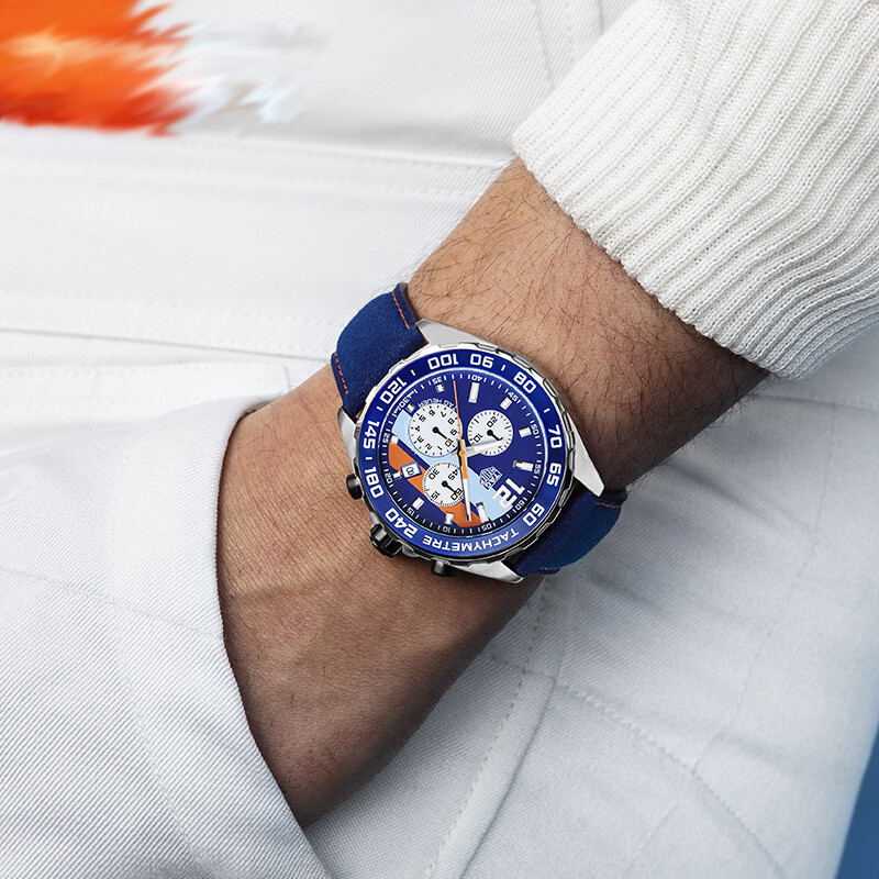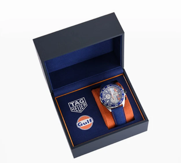 This watch is a stunning tribute to racing heritage! The bold Gulf Oil colors pop on the dial, giving it a sporty yet classy look. The quartz chronograph keeps perfect time, and the stainless steel case feels durable yet comfortable. It’s lightweight, easy to read, and the orange accents add a fun retro vibe. Perfect for car enthusiasts or anyone who loves a standout timepiece. The design pays homage to classic racing without being over the top—definitely a head-turner!
