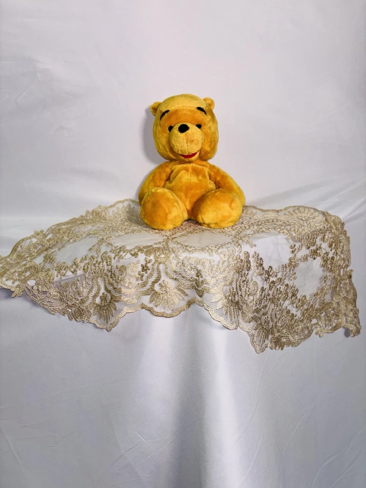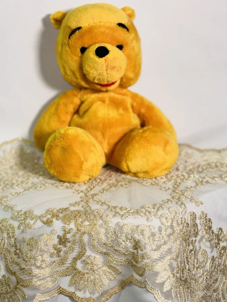 This is a Disney-branded plush beaned toy featuring the character Winnie the Pooh. It is tagged by Disney and showcases a smiling expression. The stuffed animal is original and authentic, making it a collectible item for fans of the Disney franchise and Winnie the Pooh.