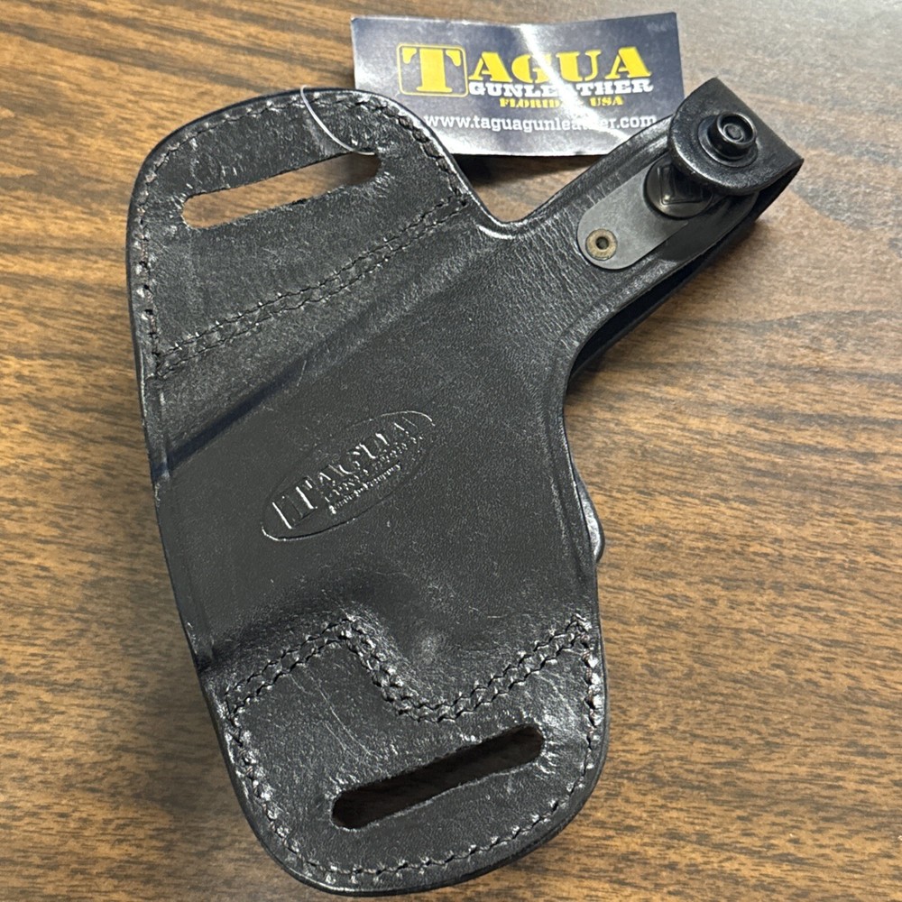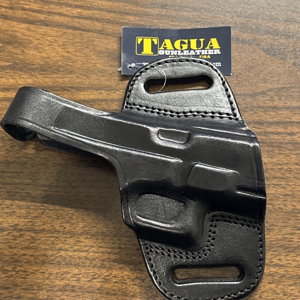 The Tagua Mini Thumb Break Belt Holster is designed for GLOCK 17, 22, and 31 pistols in .40 S&W, 9 mm Luger, and 357 SIG calibers. Made of black leather, this right-handed holster features a Level 2 retention system with a thumb break for added security. It can be attached to the belt for OWB carry at the 2, 3, 4, or 5 o'clock positions with a positive forward cant. This lightweight and weather-resistant holster is suitable for shooting sports activities and is crafted in Paraguay by the Tagua brand.