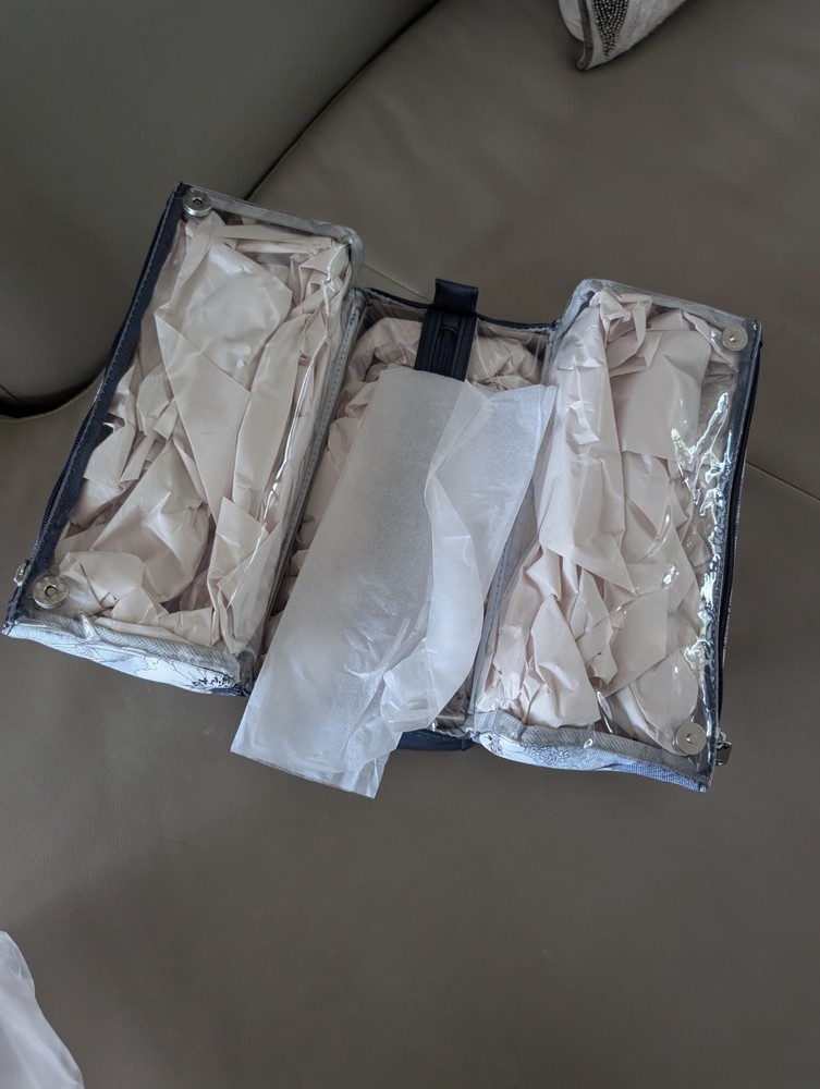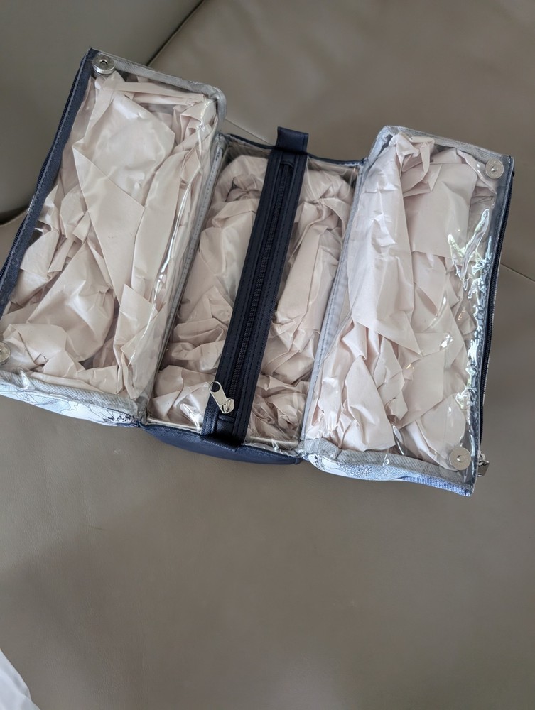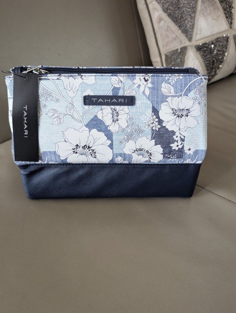 Tahari Pyramid Cosmetic Travel Bag Trifold for Makeup In Blue And White.