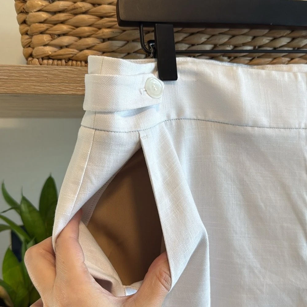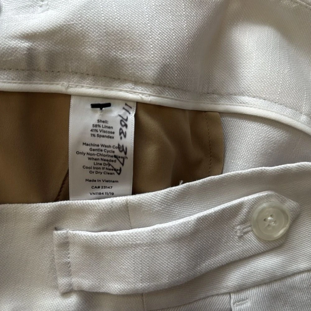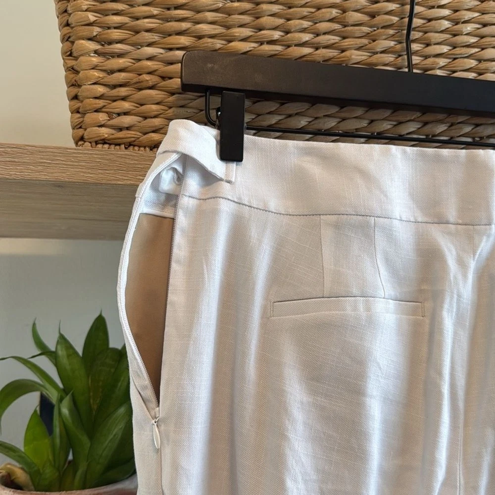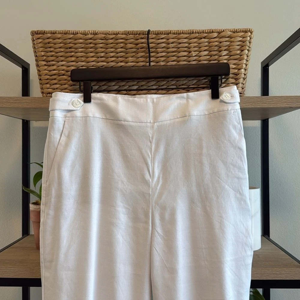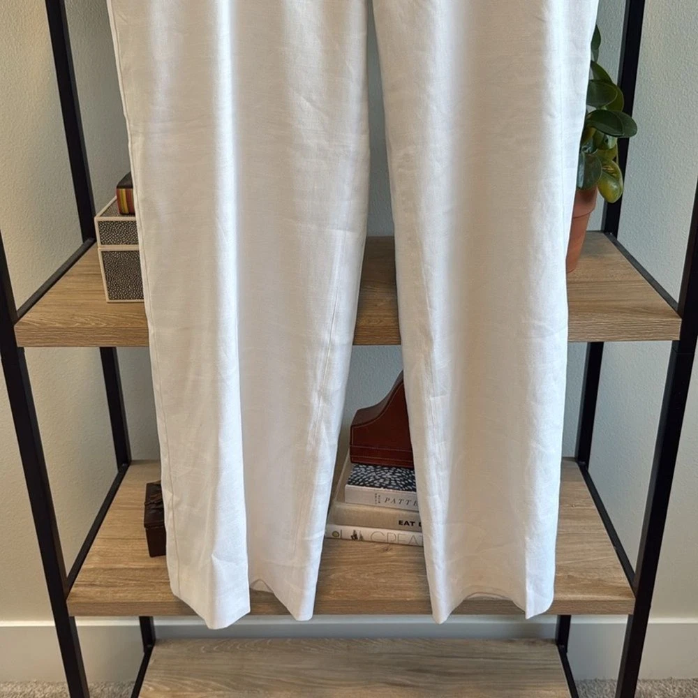 Talbots Linen Blend High-Rise Wide Leg White Career Dress Pant Trouser, 10 EUC- no wear to note/like new. 58% Linen, 41% Viscose, 1% Spandex mid-weight woven fabric. 4 functional pockets (back pockets are tacked closed but can be opened up). Hidden side zip. Classic, modern business professional/ business casual officewear. Wardrobe staple. Classic & well constructed. Timeless staple piece that never goes out of style. Measurements taken flat: Waist: 17" Front Rise: 13" Inseam: 31" Leg Opening: 11.25"