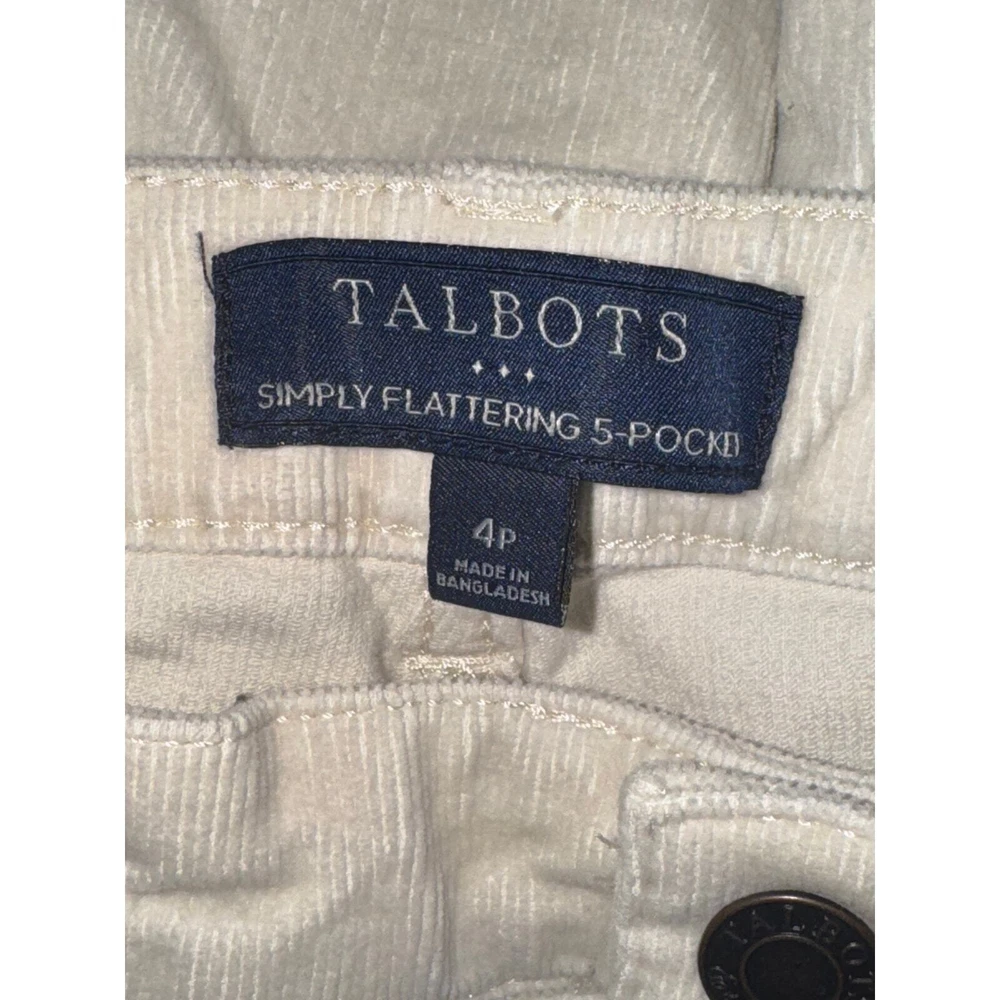 Talbots Simply Flattering 5 Pocket Corduroy Straight Leg Pants Women 4 Petite Retro Vintage Inspired Casual Work Office Career Business Professional Classic Capsule Wardrobe Basic Preppy Size 4P petites. Beige, cream, light tan, ivory color. Zip and button closure. 5 pocket design. Excellent preowned condition EUC, no flaws. Professional, highly rated seller, quick shipper, open to offers! Approximate measurements: Waist: 30 inches Inseam: 25 inches Rise: 9 inches New Retail Price: $99.50