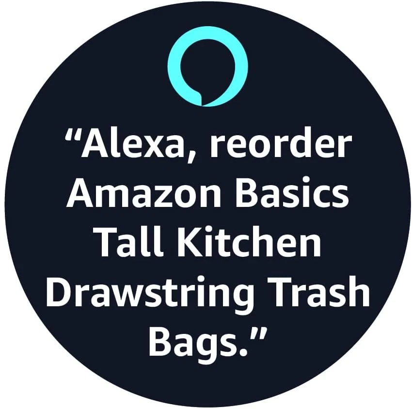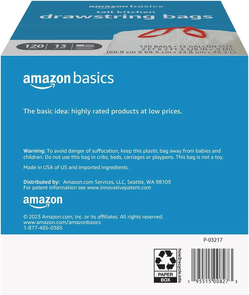 Includes 120 tall kitchen garbage bags Individual bag dimensions: 24inches wide x 27 3/8 inches tall with 0.9 mil bag thickness Each trash bag has a 13-gallon capacity White trash bag with red drawstring closure for easy tying and carrying Alexa voice shopping enabled: to place your next order, just say, “Alexa, reorder Amazon Basics Tall Kitchen Drawstring Trash Bags." Product Description Amazon Basics Tall Kitchen Drawstring Trash Bags, 13 Gallon, 120 Count, Individual bag dimensions: 24inches wide x 27 3/8 inches tall with 0.9 mil bag thickness. Each trash bag has a 13-gallon capacity. From the Manufacturer Amazon Basics