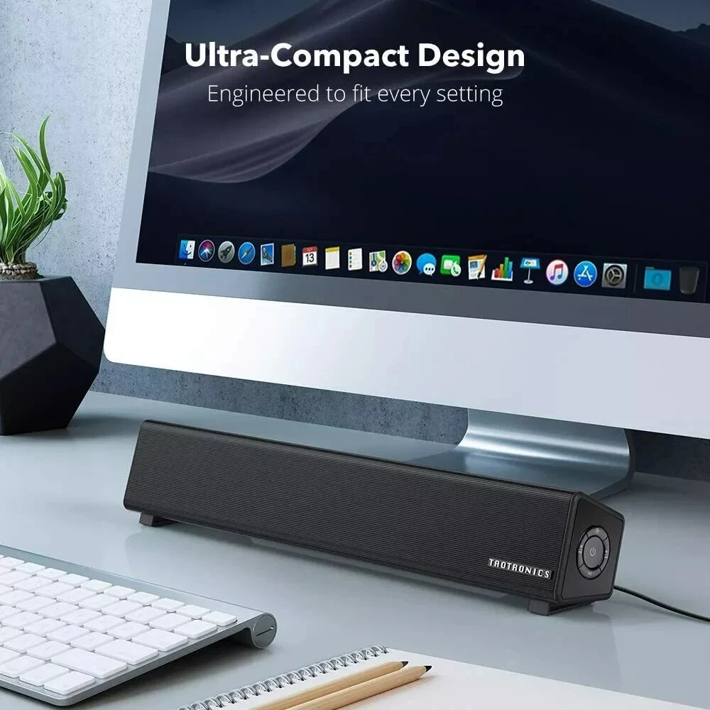 TaoTronics Bluetooth 5.0 Computer Speaker Wired/Wireless Mini Sound Bar SK025 Stream wirelessly: connect via Bluetooth 5.0 or plug in physical AUX and RCA cable connections, choose your most convenient Immersive sound experience: housing Two 5W full range speakers, The sound bar delivers a crisp, mesmerizing sound Easy set up in minutes: The package contains all equipment needed - Unpack, plug in, and enjoy Widely compatible: The computer sound bar also connects with your phone, tablet, MP3 player, or any other device with Bluetooth, RCA, or audio connectivity Fits your desk perfectly: The ultra-slim sound bar is tailored to save precious space and avoid cluttering -----
