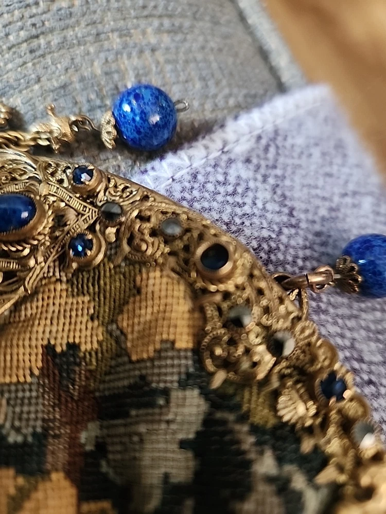 The Tapestry 1930's Blue Glass Beads Purse is a unique and stylish accessory that reflects the vibrant colors and intricate designs of the 1930s era. Made from high-quality tapestry material with beautiful blue glass beads, this purse exudes elegance and charm. Its multi-color scheme adds a playful touch to any outfit, making it a standout piece for any vintage enthusiast looking to add a touch of retro flair to their wardrobe. Perfect for carrying essentials in style, this purse is a must-have for those who appreciate classic fashion with a modern twist.