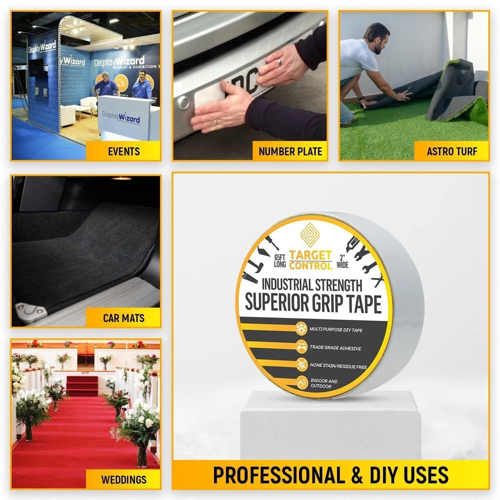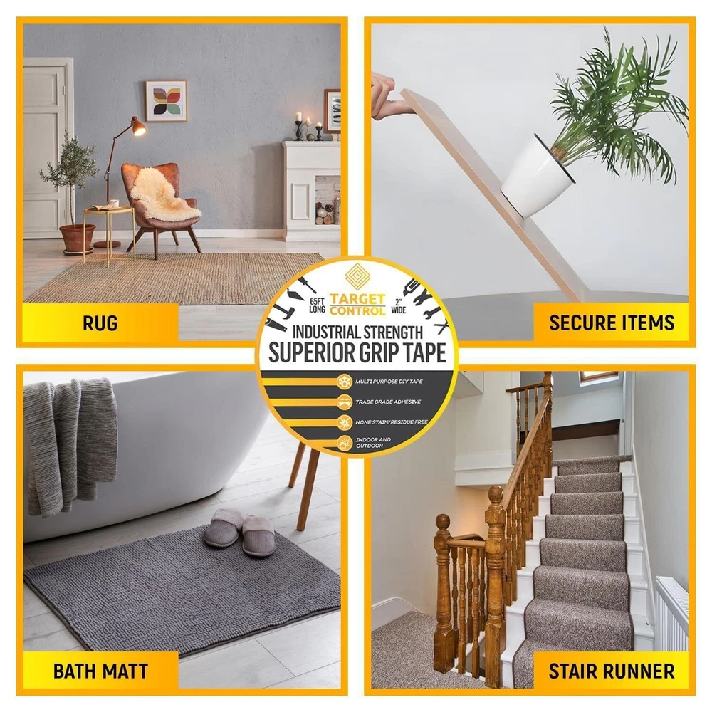 CONTACT US DIRECTLY FOR FREE & PREPAID RETURNS Targetcontrol™ | 65ft X 2'' | Carpet Tape Double Sided, Rug Tape Grippers for Item Description ✅ Carpet Tape Double Sided ➔ Our Strong Rug Tape For Area Rugs On Tile The Carpet Tape For Tile Floors Are Used For Hard Surfaces Only & NOT Rug to Carpet. We Guarantee Our Double Sided Carpet Tape Heavy Duty Will Be Perfect For Your Rugs. ✅ Multi Purpose ➔ Target Control's Double Sided Tape For Rugs, Are Widely Used On Outdoor Carpet Tape, Rug Gripper Tape, Carpet Adhesive, Outdoor Rug Tape For Concrete, Tiles, Wooden Floors ETC. ✅ No Residue Left ➔ Our Unique Is Made With A Clear Solution And Does Not Leave Any Marks When You Remove It, Our Double Sided Rug Tape Are Extremely Heavy Duty & Is Designed To Non Stain, Easily Remove The Tape Without It Leaving Any Residue Or Trace Of Sticky Adhesive That Can Damage Your Floor (IMPORTANT: DO NOT USE ON CARPET THIS IS FOR HARD SURFACES ONLY). This Product, Like Any Strong Double Sided Tape, Is Not To Be Used On Top Of A Carpet - Only To Tape To Floorboards Etc. ✅ Extra Safety ➔ Target Control Extra Strong Double Sided Tape Is Just As Good As Carpet Glue Adhesive. It's Very Strong Carpet Gripper Strips To Ensure Your Carpet Wont Move We Make Sure We Extra Strong Double Sided Tape Heavy Duty, Carpet Grips Ensure Safety & Peace of Mind. ✅ Professional Use ➔ This Double Tape Is Used By Many Professionals As Carpet Binding Tape, Carpet Tape For Rugs On Top Of Flooring, Double Sided Tape For Carpets, Carpet Grip, Carpet Joining Tape, Carpet Edging Tape, Carpet Tacks For Stairs. REVIEWS The product came very well packaged. I'm very happy. thank you for everything. Seller strongly recommended. This is great! I definitely recommend! Product looks amazing Delivery was fast. Excellent seller, great communication. I advise everyone