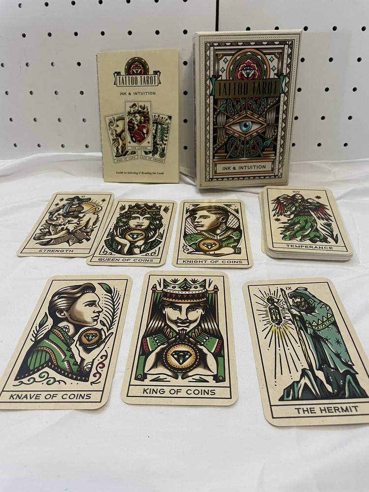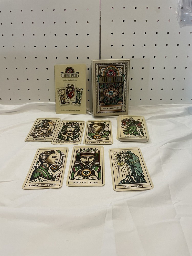 The "Tattoo Tarot: Ink & Intuition" is a collector's edition card set with 78 illustrated cards and a booklet for divination. The cards feature artwork by Megamunden and are designed for adults interested in divination, tarot, and card games. The set was published in 2018 by King Publishing, Laurence in the United Kingdom. The cards measure 6.2 inches in length, 2.1 inches in height, and 4.4 inches in width, with a weight of 15.5 ounces. Thanks for stopping in check out my online thrift stuff added daily much love Shelly J 💚