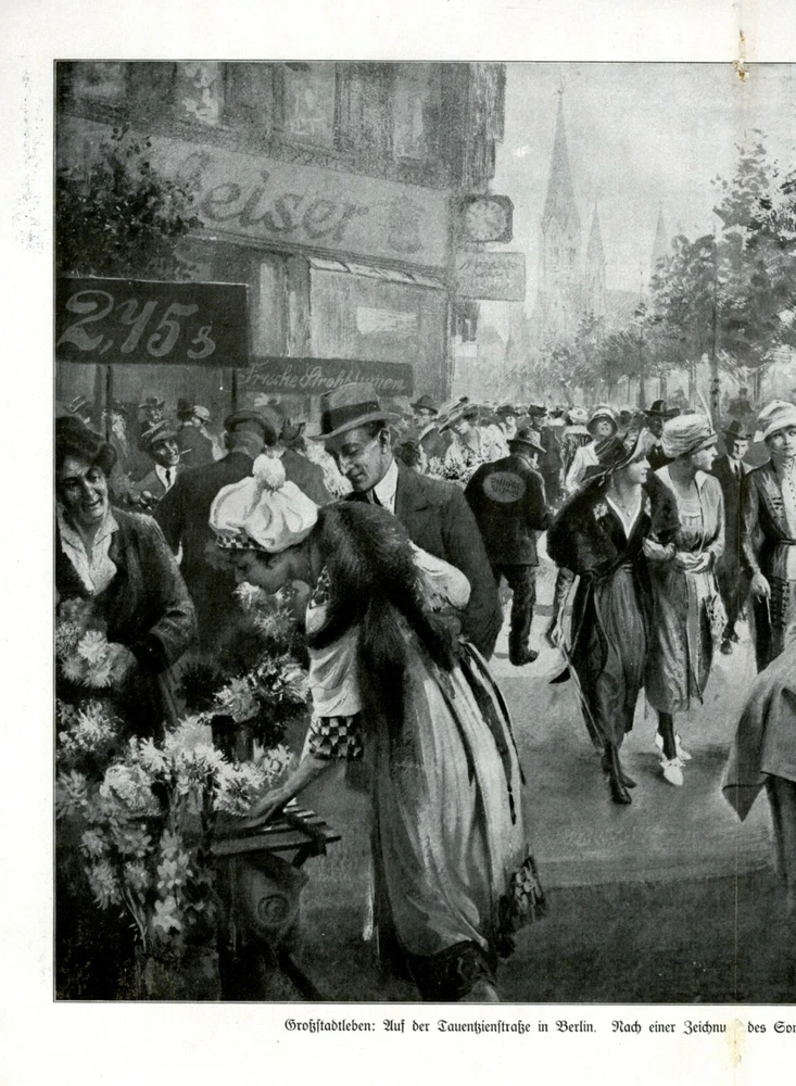 (CJ) (F21) Deutsch / English 0 Doppelseitiger Kunstdruck aus dem Jahr 1919 Der Kunstdruck wurde einem Journal, einem Buch oder einer Zeitung entnommen und lässt sich daher genau datieren. Auf Wunsch nenne ich dem Käufer gerne, wo und wann dieser Kunstdruck veröffentlicht war. Es handelt sich um keine moderne Kopie, sondern um einen seltenen, 1919 gedruckten und veröffentlichten Kunstdruck, ein Original der Zeit. 0 " Auf der Tauenzienstraße in Berlin " 0 Very large center fold German 1919 art print This early and hard to find art print has been carefully removed from an old German magazine, book or newspaper and is guaranteed to be an original piece. It is no photocopy or reprint but a 1919 printed and published art print, a wonderful historical collectible. The translation of the German title (to the best of my ability): 0 " On Tauenzienstrasse in Berlin " 0 Kunstdruck nach einer Zeichnung von / Art print after a drawing by Felix Schwormstädt, * 1870 in Hamburg, † 1938 in Locarno 0 Größe / Size: Größe der Doppelseite mit Falz in der Mitte (so veröffentlicht) mit weißem Rand wie unten abgebildet 39 cm x 54 cm . Auf Grund der Größe kann ich trotz A3 Scanner den Kunstdruck nicht in einer Gesamtansicht zeigen. Bild 1 zeigt die Mitte, Bild 2 die linke Seite, Bild 3 den Falz vorne, Bild 4 die rechte Seite und Bild 5 den Falz auf der Rückseite. Size of the double page with a fold in the center (as issued) with the white margins like shown below 15.3" x 21.3" inches . Due to the size of the double page compared to my scanner I can not show an overall view of the publicity. Image 1 shows the center, image 2 the left side, image 3 the fold frontside, image 4 the right side and image 5 the fold backside. 0 Zustand / Condition: Druck der Rückseite schimmert im weißen Rand vereinzellt dezent durch, oben links etwas auffallender. Sonst nur leichte Gebrauchsspuren im weißen Rand sowie Klammerlöcher mit leicht schadhaften Stellen im Falz - siehe Scans. Kunstdruck selbst hat bis auf den Falz keine Mängel. Nach Schulnoten bewertet würde ich - ohne Berücksichtigung des Falzes - sagen, Zustand Rand: 2-3, Zustand Kunstdruck: 1, Schönheit und Seltenheit des Kunstdrucks: 1*. Die Rückseite ist bedruckt, hat aber inhaltlich nichts mit der Vorderseite zu tun. Das Original ist schärfer als von meinem Scanner wiedergegeben, die Schrift ist klar und deutlich zu lesen. A bit of reverse print visible in a few spots in the white margin, most significant marigin upper left. Otherwise only slight signs of handling in the white margin and staple holes with a bit surface wear around in the fold - see scans. Art print has - beside the fold - no flaws. Without consideration of the fold I would say condition margin: almost good, condition art print: very good, beauty and rarity: excellent. The reverse sides are printed but have nothing to do with the content of the front. The original is better than reproduced by my scanner, the writing is very good to read. 0