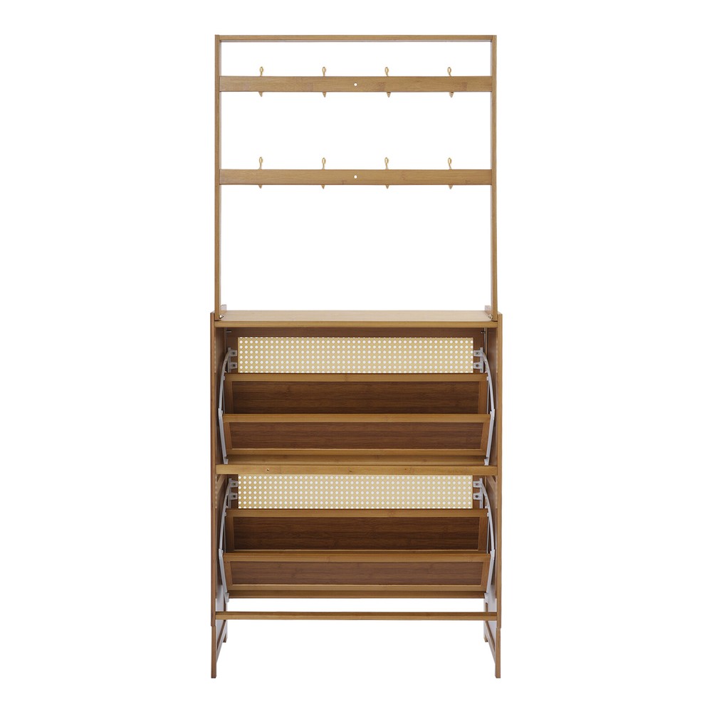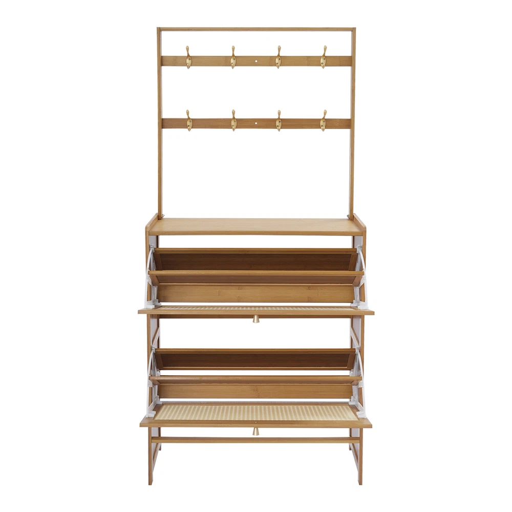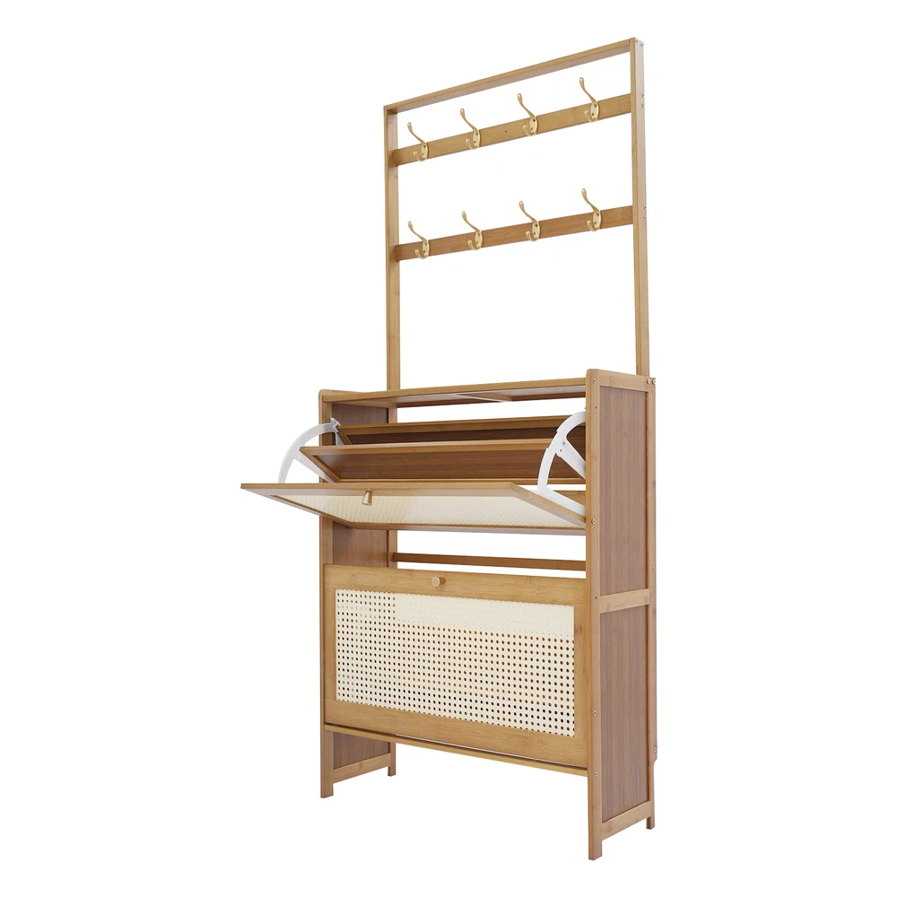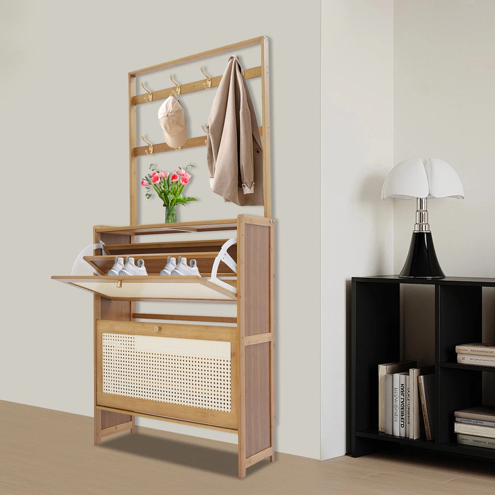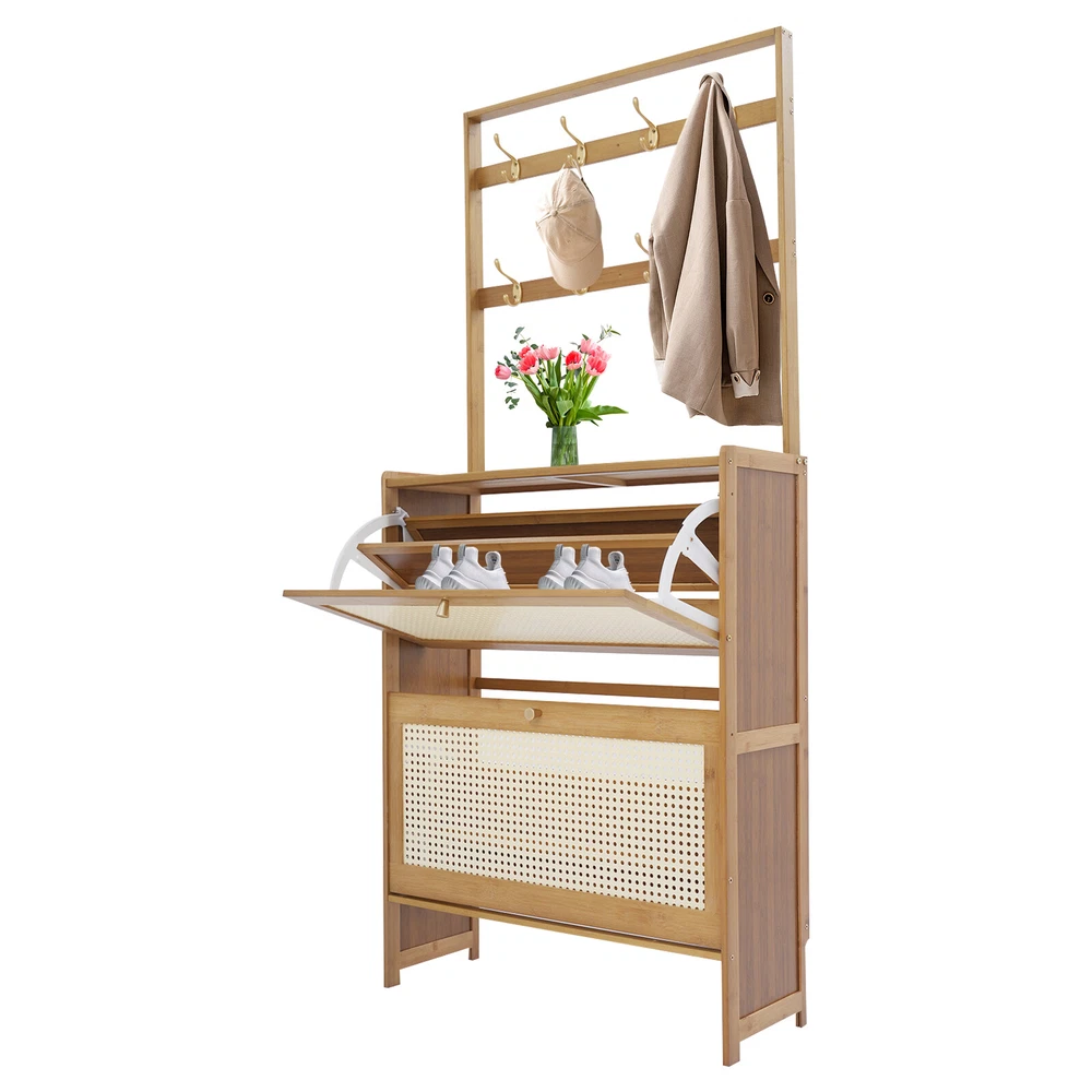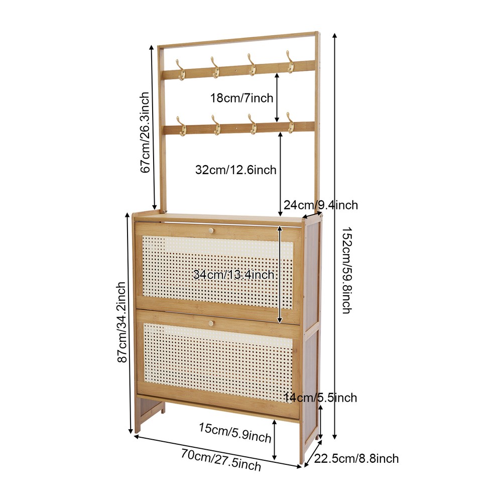 Tawny Flip Door Shoe Cabinet Shoe Cabinet for Entryway Living Room 2 Tiers Description Are you still struggling with shoe storage? Then please take a look at our product. Our shoe cabinet is an efficient organizing solution designed for the home. It combines a rational spatial layout with a practical design, aiming to provide a storage space for your shoes that is both aesthetically pleasing and functional. Whether it's sneakers, casual shoes, or boots, it organizes them all neatly. Key Features Made to Last: High-class bamboo, ABS, and MDF with an exquisite spray painting process make this product sturdy, scratch-resistant , impact-resistant , and not easy to corrode and deform, ensuring a long service life. Large Storage Capacity: The product features a two-tier design with double storage space on each tier for more shoe storage. Whether it's your daily wear or seasonal shoes, they can be arranged in an orderly manner to meet the diverse needs of family members. The bottom area can also store shoes. User-friendly Design: This product adopts a flip door design, making it easy to open and close. It is not only effective in preventing puppies from chewing on your shoes, but it also prevents dust from entering the shoe cabinet. The shaft is sturdy and durable, with a cushioning design to ensure low noise. Thoughtful Design: The 8 hooks allow you to hang headphones, bags, hats, and other items, providing you with additional storage space. Good Ventilation: The mesh ABS breathable cabinet doors enhance air circulation and effectively prevent mold and odors from growing inside. Stable Structure: The product is equipped with an anti-tip fixture that attaches it to the wall, making its structure more stable and preventing it from tipping over. Up to 16.53 lbs load-bearing capacity of the top countertop allows you to place potted plants, small speakers, bags, and other items, providing you with extra storage space. High Adaptability: The divider in the middle of each tier can be removed, thus allowing you to place shoes of different heights. Space Saving: The vertically slim structure allows you to place it behind the door or in a corner, saving space. Enjoying Tidiness: It cleverly integrates shoe storage into life, placing it at the doorway to store your messy shoes, making it pleasing to the eyes as soon as you open the door, bringing you an organized lifestyle. Details Practical Handles : The handles on the cabinet doors make it easy for you to open and close the doors and get your shoes. Reserve Skirting : This design allows the cabinet to be placed close to the wall, thus saving space. Raised Cabinet Feet: The 5.9-inch raised cabinet feet are designed to make it easy for you to change shoes, and it is convenient for you to clean the floor. Application It is suitable for living rooms, entrances, terraces, or bedrooms, and can be used to store slippers, casual shoes, high heels, leather shoes, boots, and other shoes, as well as some daily necessities such as keys, bags, scarves, alarms, etc. How to Fix without Punching Tear off the protective film of the traceless sticker. Stick a large traceless sticker on the surface that fits the wall, and a small traceless sticker on the surface that fits the cabinet. Fix the fixture onto the shoe cabinet. Press the shoe cabinet onto the wall and secure it. How to Fix by Drilling Holes The shoe cabinet holes are aligned with the wall and marked with holes. Drill holes at the marked positions. Screw in the screws to secure the shoe cabinet to the wall. Specification Material: Bamboo, ABS, MDF Color: Tawny Process: Spray Painting Style: Modern Assembly Required: Yes Mounting Type: Free Standing Number of Tiers: 2 Overall Product Size: 70*24*152cm/27.5*9.4*59.84in Cabinet Height: 87cm/34.25in Hanging Rack Height: 67cm/26.38in Tier Spacing: 34cm/13.4in Feet Height: 15cm/5.9in Countertop Load Capacity: About 7.5kg/16.53lbs Package Size: 93.5*34.5*10.5cm/36.81*13.58*4.13in Gross Weight: 8.4kg/18.52lbs Net Weight: 7.98kg/ 17.59lbs Package Included 1* Shoe Cabinet Other Accessories for Assembly Notes Please avoid soaking in water or in a humid environment for a long time. Please do not let children climb to avoid accidents. The traceless sticker is suitable for flat and smooth ceramic tile surfaces, wooden walls, smooth walls, and walls that do not shed dust or peel. Please note that the quantity of shoes stored depends on the style and size of the shoes. Please clean regularly and wipe with a soft damp cloth (not included). Please note that shoes, flower pots, and other items are not included. Please allow the slight color difference caused by the shooting light and 1-3cm error due to manual measurement, and make sure you do not mind before ordering. Payment Delivery details Terms of sales About us Contact us Payment We accept ebay payment 。 Fees such as import duties, taxes are not included in the item price or shipping costs. These charges are the buyer's responsibility. Delivery details Shipping: 2-9 working days to: USA Terms of sales We maintain high standards of excellence and strive for hundred percent customer satisfaction. Feedback is very important to us. We hope that you contact us immediately before you give neutral or negative feedback, so that we can address your concerns. It is impossible to address issues if we do not know about them! About us Your satis faction is our ultimate goal. We work hard to earn your trust and future business. Our certified technicians have tested each item before shipping. The unit comes with 1 year limited warranty on all manufacturing defects. a) If you receive a defective item, you may return it or ask for a discount. Please contact us within 14 days after you receive the package. b) What you returned must be intact and in its original packaging as re? u. Customer is responsible for shipping costs of the returned item. c) We will cover the cost of shipping back t with the shipping rate indicated in the registratio