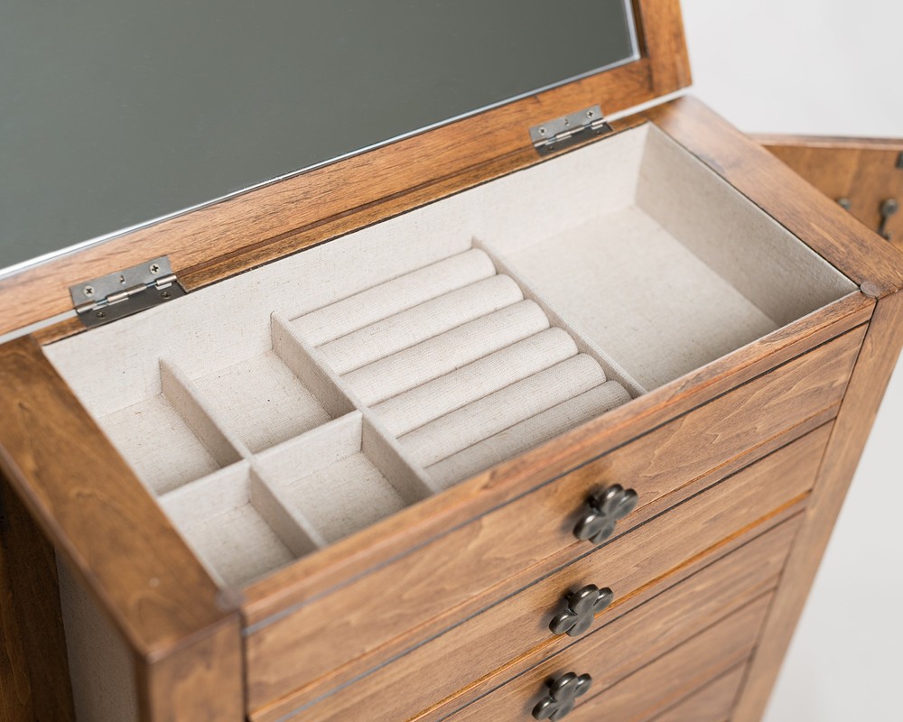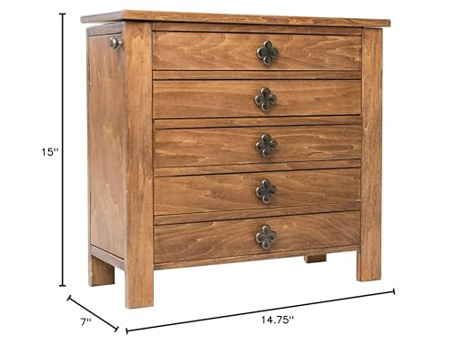 With the Taylor Jewelry Chest, you'll have the perfect storage solution for all your precious jewels! This antique-inspired design will transport you back in time while still providing modern-day organization. You'll love the multiple ring rolls, divided compartments, and spacious drawers with additional divided compartments for all your bracelets, earrings, note cards, and keepsakes. The sweet clover knobs add a touch of charm to this already lovely piece. Plus, the side doors with necklace hooks will keep your strands safe and stylishly stored. You can trust the lined interior to protect your precious jewels, making this the perfect gift for any jewelry lover looking for a unique and functional storage solution. The sturdy construction ensures durability and longevity, while the compact size fits perfectly on any dresser or vanity, saving you precious space. Antique-inspired design with modern-day organization Multiple ring rolls in top compartment for easy access Divided compartments to keep your jewelry organized and tangle-free Clover knobs for a touch of sweetness and charm 5 spacious drawers with additional divided compartments for bracelets, earrings, note cards, and keepsakes Side doors with necklace hooks for safe and stylish storage Lined interior to protect your precious jewels Product Dimensions: 15" H x 7" D x 14.75" W