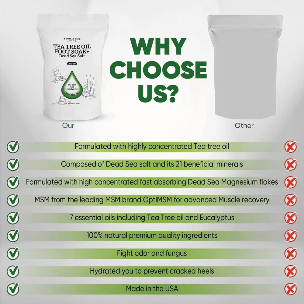 š£ Aromasongās Foot Soak: Our Natural foot bath salt is Formulated with Magnesium Flakes, Dead Sea Salt and its 21 Minerals that soothes tired, achy Feet. Couple that with Tea Tree Oil and all the benefits of the 7 essential oils, fast absorbing dead sea magnesium flakes, and OptiMSM. A 20-minute foot care soak of Aromasongās Tea Tree Foot Soak will give your feet a daily pampering in the comfort of your own home. š£A Treat for Feet: Our therapeutic antifungal foot soak is infused with tea tree oil and dead sea bath salts which help address problems like toenail fungus, callus or dry skin. Itās great to use as a foot fungus soak, as a foot detox soak, or as a foot soak for dry feet or peeling skin. š£Smelly Feet Solution: Combat smelly feet with our smelly feet treatment for women and men. Our foot soak uses tea tree oil foot soak properties to act as an effective foot detox for smelly feet, leaving your feet feeling fresh and odor-free. as a foot odor eliminator for feet š£ Relax Your Senses in our : Rich in 100% Natural Eucalyptus essential oil, our pedicure foot soak helps ease tension and Soothes Sore Feet . It's great to destress with our foot spa soaking salts it will leave your skin soft, supple and fresh .Also great to use as a foot soak for callus removal. š£ Perfect for Athletes: Recharge your body after training or working out. This natural athletes foot soak is specially formulated for fitness trainers, sports runners and doctors, nurses or anyone who is always on their feet. š£ Cruelty Free: We will never experiment on animals; we don't have to because nothing toxic or harmful will ever go into our products. We believe in making effective products from fresh Dead Sea Salt, the finest essential oils and safe, non-toxic ingredients.