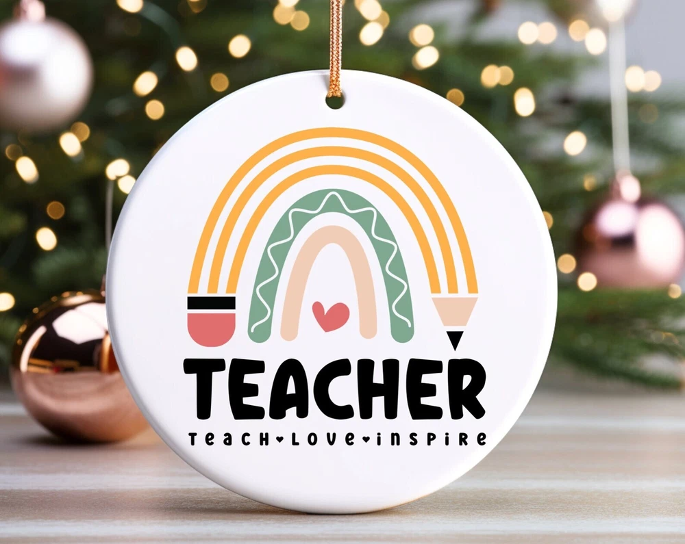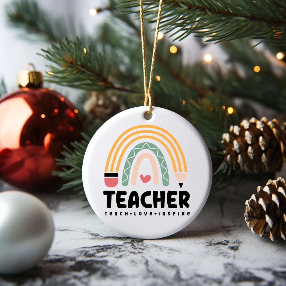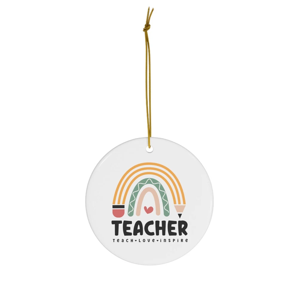Teach Love Inspire Ornament Teacher Ornament Holiday Teacher Gift Mentor Gift Material: Ceramic Color: White Shapes: Circle, star, heart and oval Can be printed on both sides Imprint full-color artwork, photos, or logos Hole for hanging string and hanging string included Printed in the USA