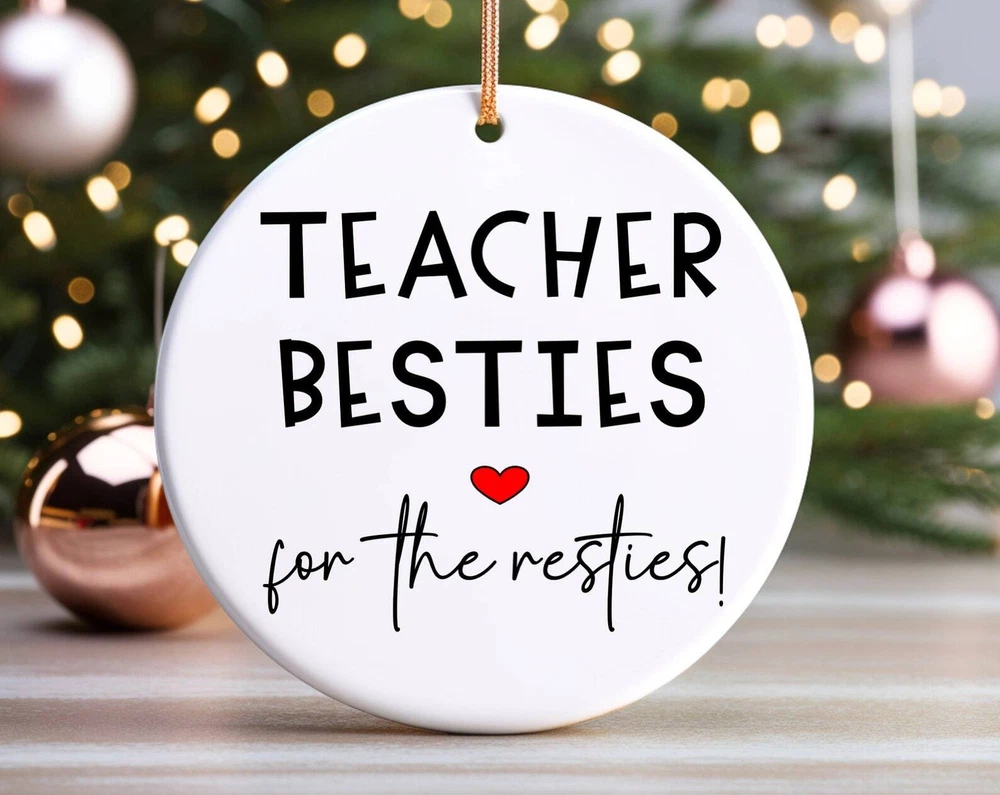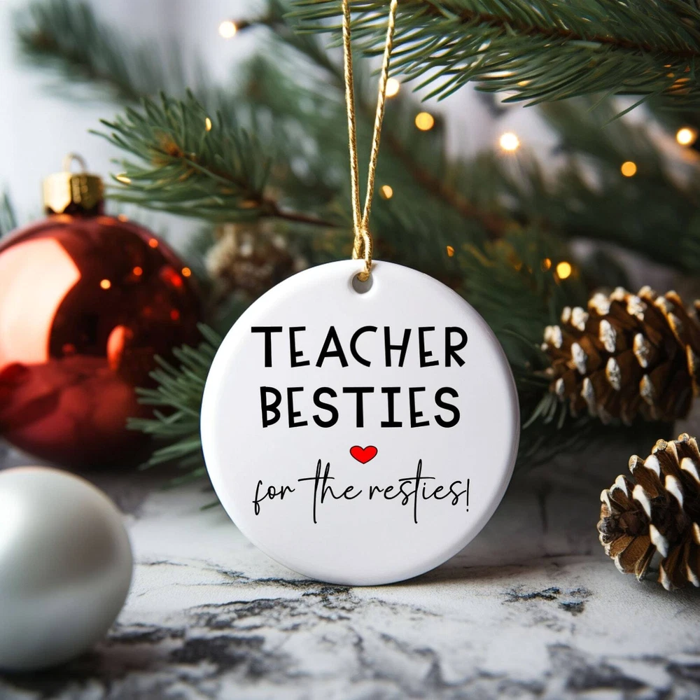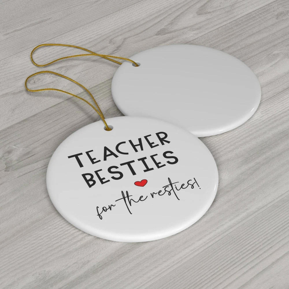 Teacher Bestie Christmas Ornament Teacher Ornament Teacher Bestie Gift Friend Gift Thank You Gift Material: Ceramic Color: White Shapes: Circle, star, heart and oval Can be printed on both sides Imprint full-color artwork, photos, or logos Hole for hanging string and hanging string included Printed in the USA