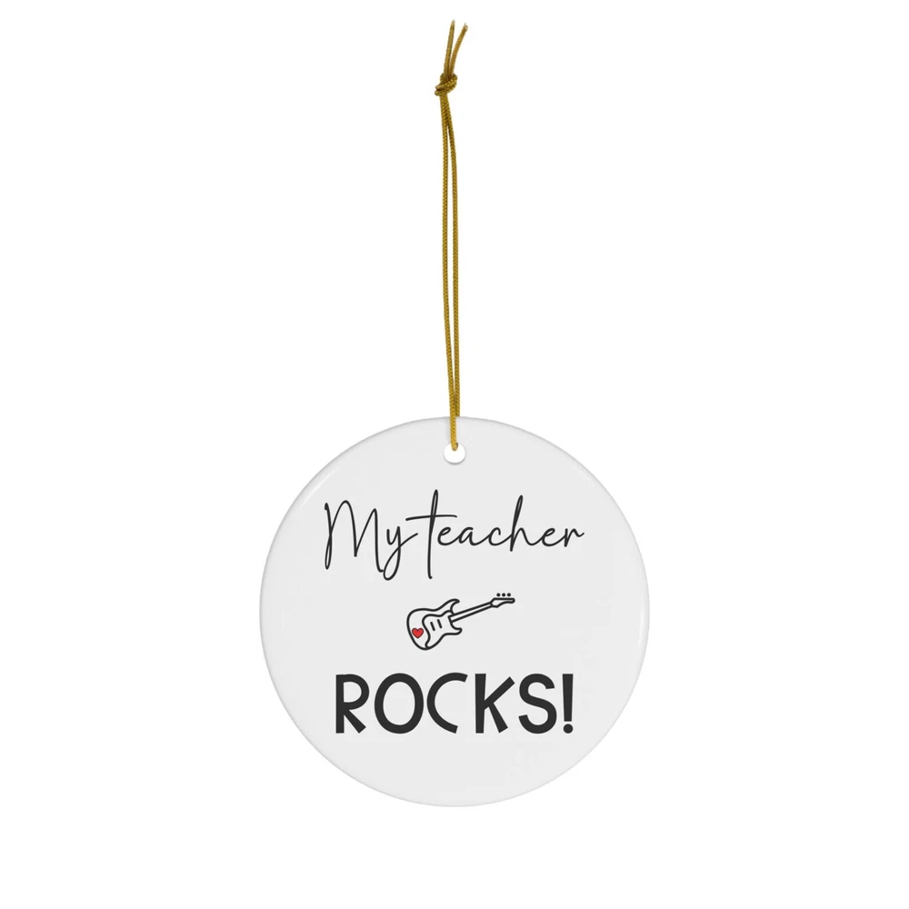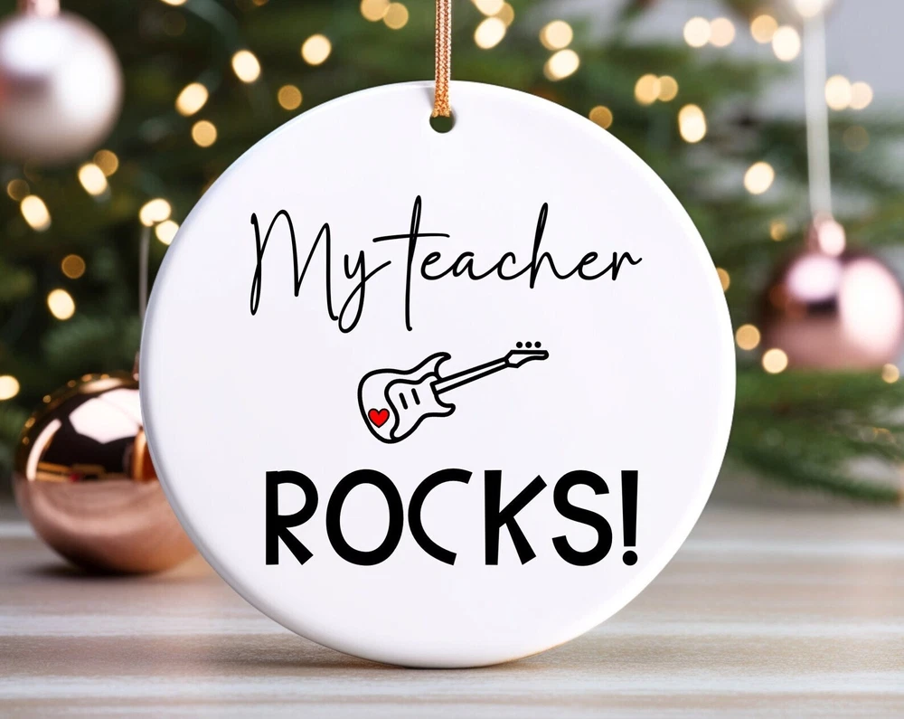 Teacher Christmas Ornament My Teacher Rocks Ornament Thank You Gift Holiday Gift Material: Ceramic Color: White Shapes: Circle, star, heart and oval Can be printed on both sides Imprint full-color artwork, photos, or logos Hole for hanging string and hanging string included Printed in the USA