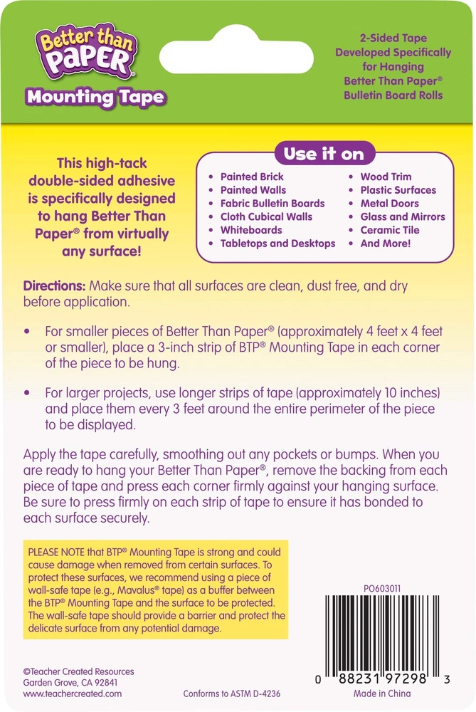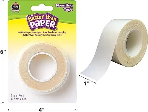 Securely hang your bulletin board rolls with this high-tack double-sided adhesive. This mounting tape is specifically designed to hang Better Than Paper® from virtually any surface! Use it on painted brick, painted walls, fabric bulletin boards, cloth cubical walls, whiteboards, wood trim, plastic surfaces, metal doors, and much more! Also works with butcher paper, and other types of bulletin board paper. PLEASE NOTE: Better than Paper® Mounting Tape is strong and could potentially cause damage when removed from certain surfaces. To protect these surfaces, we recommend using a piece of Mavalus® tape or tape specifically designed not to damage walls as a buffer between the Better than Paper® Mounting Tape and the surface to be protected. This mounting tape is specifically designed to hang Better Than Paper from virtually any surface High-tack double-sided adhesive Works with butcher paper, construction paper, and other types of bulletin board paper Use it on painted brick, painted walls, fabric bulletin boards, cloth cubical walls, metal doors, and much more