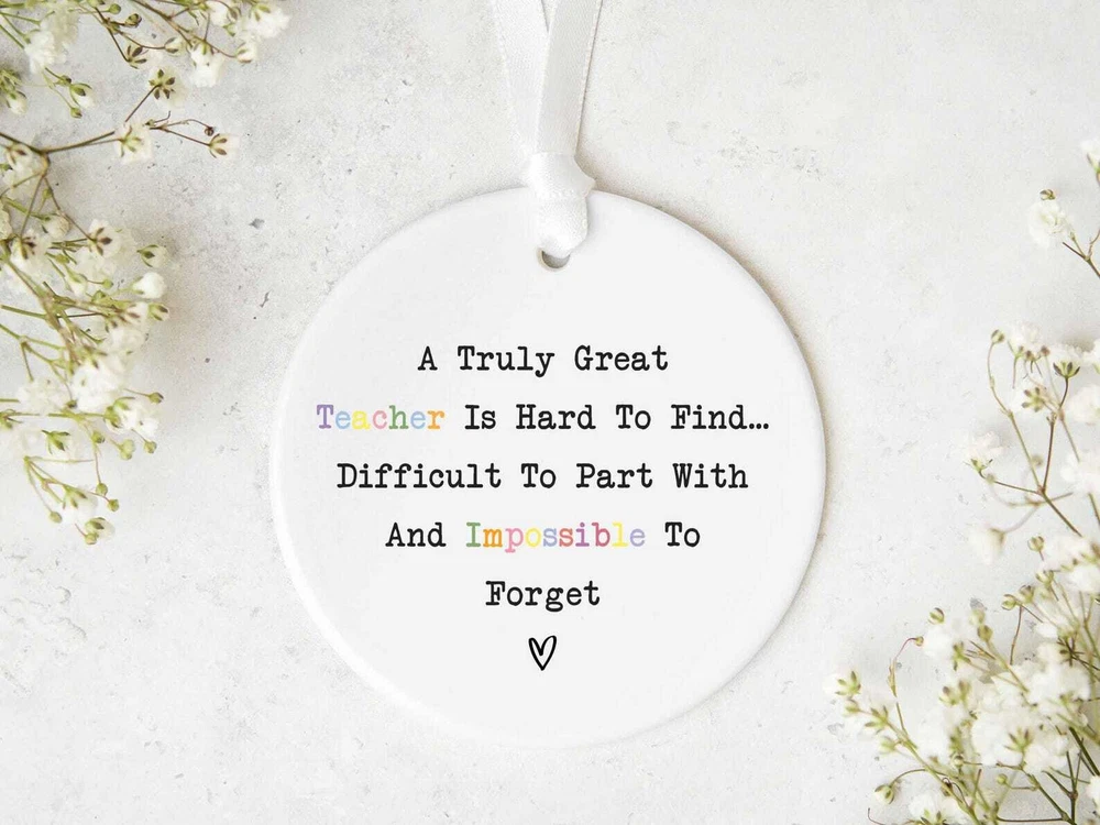Teacher Gift Cks80 Gift For Teacher Thank You Gift Teacher Present School Leaver Gift School Leavers Teacher Present Thank You Material: Ceramic Color: White Shapes: Circle, star, heart and oval Can be printed on both sides Imprint full-color artwork, photos, or logos Hole for hanging string and hanging string included Printed in the USA