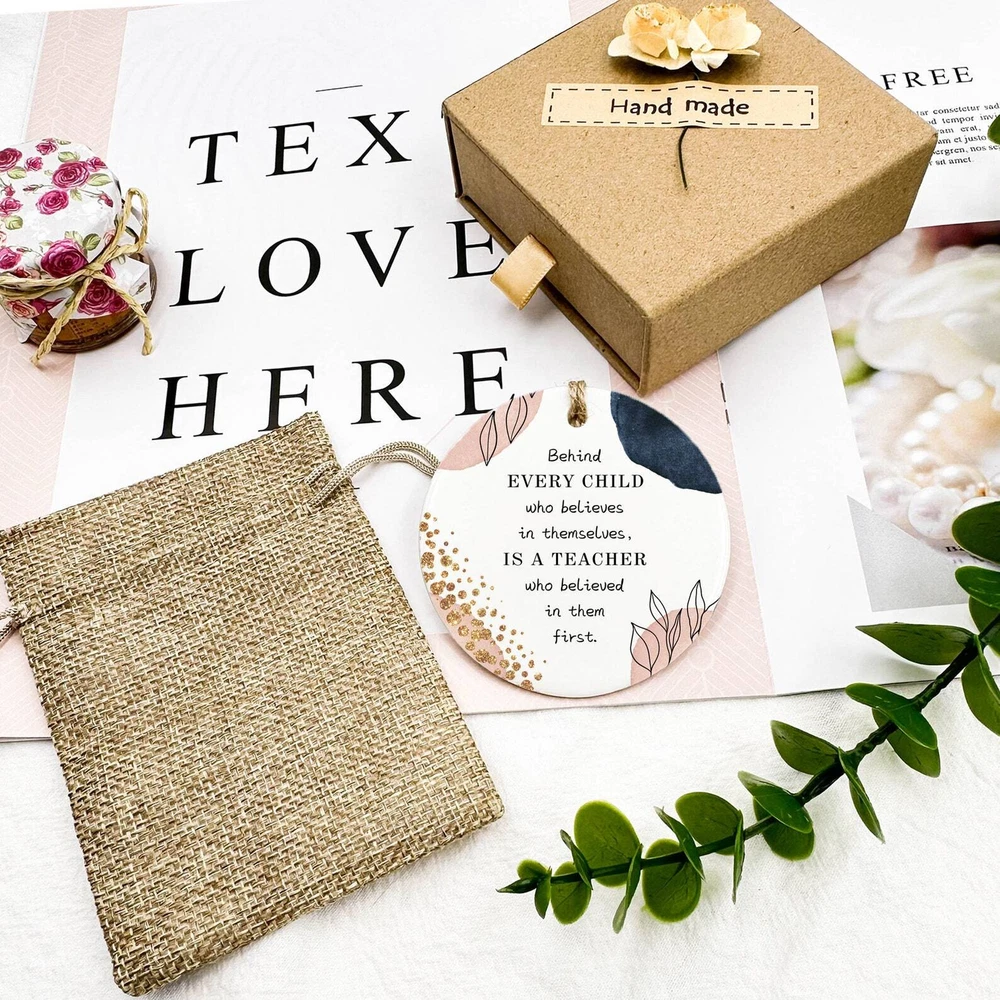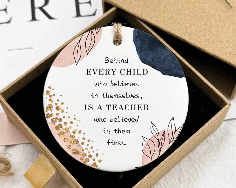 Teacher Memory Ceramic Keepsake Ceramic Teacher Gift Thank You Gift For Teacher End Of Year Teacher Appreciation Thank You Ornament Material: Ceramic Color: White Shapes: Circle, star, heart and oval Can be printed on both sides Imprint full-color artwork, photos, or logos Hole for hanging string and hanging string included Printed in the USA
