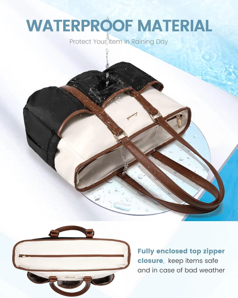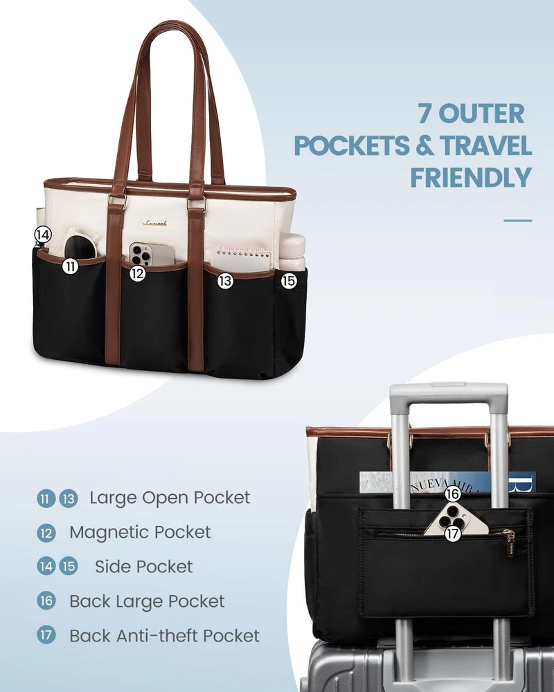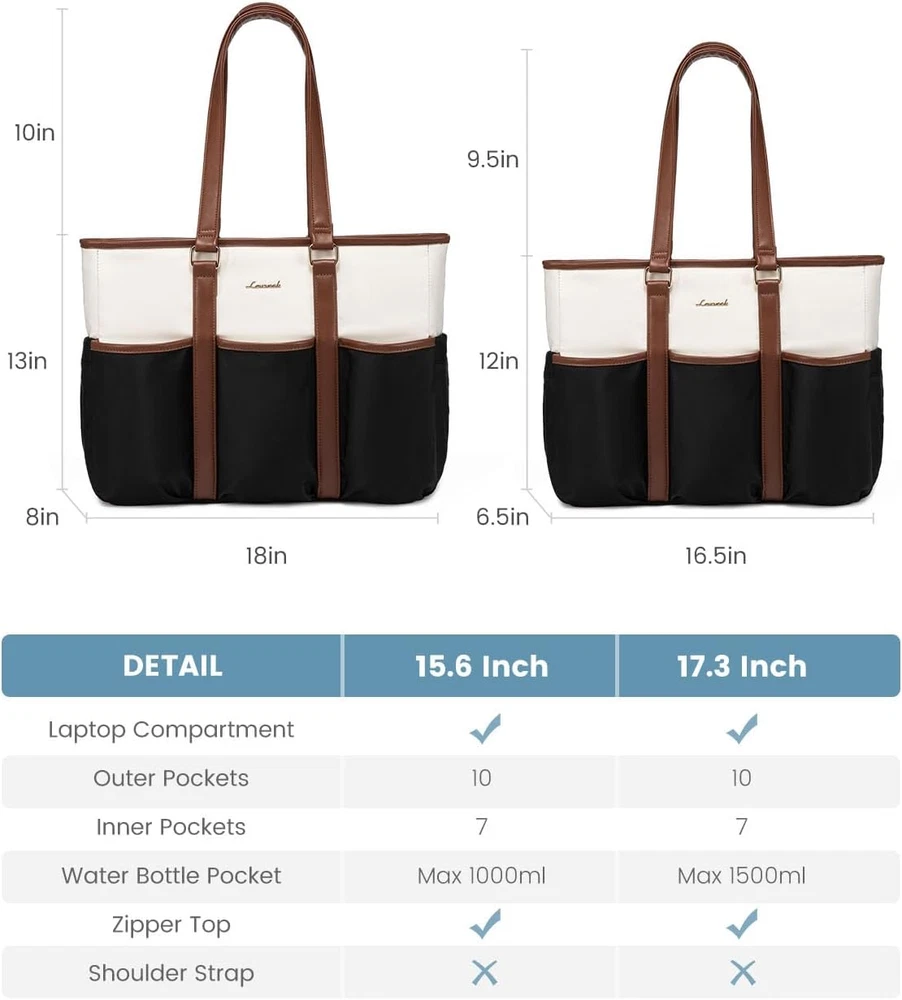 Multi-pocket Design for Versatile Use: Our work tote bag for women boasts 10 interior pockets, making it perfect for organizing your work essentials. Whether you're a nurse, teacher, or professional, this tote bag ensures everything has its place. Durable and Waterproof: Built to withstand daily use, this laptop bag for women features strong, waterproof materials that keep your items safe in any weather, ideal for work or weekend travel. Enhanced Security: The fully enclosed zipper top of the laptop tote bag for women offers maximum security, preventing items from falling out and keeping them dry in the rain. Perfect for both professional and casual settings. Stylish and Functional: With elastic side pockets that can hold large water bottles, this work tote bags for women combines style and function, ensuring you look good while staying prepared for any situation. Perfect for Various Scenarios: This bag is ideal not just as a work bag, but also as a teacher bag, nurse bag, gym bag for women, diaper bag, computer bags for laptops for women, everything tote bag, travel tote bags for women, or beach tote. Its stylish design makes it great gifts for teachers, working women and busy moms alike. Product Description Teacher Tote Bag This tote bag, with its multiple pockets and large capacity, is perfect for teachers' daily needs. It can hold many books and teacher essentials, making it an excellent Teacher's Day gift. Nurse Bag As a nurse bag, it features multiple pockets and ample space, perfect for carrying nurse essentials for work during daily hospital shifts. An ideal gift for nurses. Travel Tote Bags for Women This travel tote bag with a luggage sleeve is perfect for vacations and business trips. It ensures easy airport navigation and convenient carrying. Laptop Bag for Women Work This work bag for women features a dedicated laptop compartment, perfect for professional use. Stylish, functional, and ideal for the office or meetings. Diaper Bag This diaper bag tote features organized compartments, perfect for outdoor activities. It's stylish and practical for carrying baby essentials during outings. College Book Bag This laptop tote bag features a spacious design, perfect for carrying books and laptops. Ideal for college life, library visits, and daily classes.