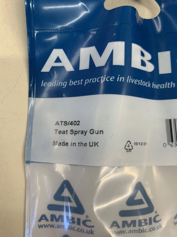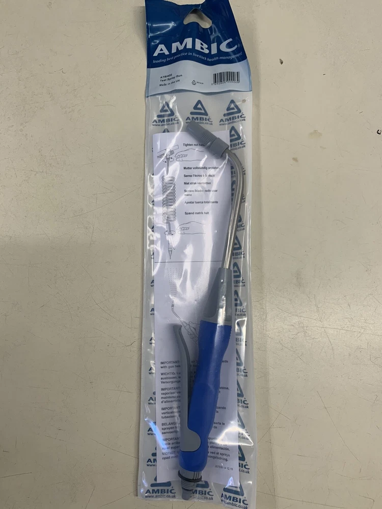 Teat Spray Gun Classic The original teat spray gun from Ambic® uses a lever style convenience and an adjustable nozzle that allows you to spray in various patterns. Features a stainless steel lance and adjustable nozzle. Ambic guns are vacuum operated so they require no electricity. The unique Dump Valve automatically back-flushes the chemical intake filter, means no mess when you switch off or change guns. This is the teat spray gun only, additional Ambic parts are sold in our store as well!