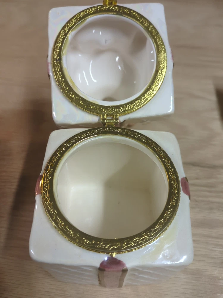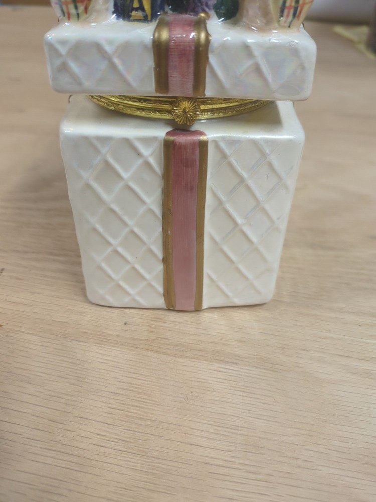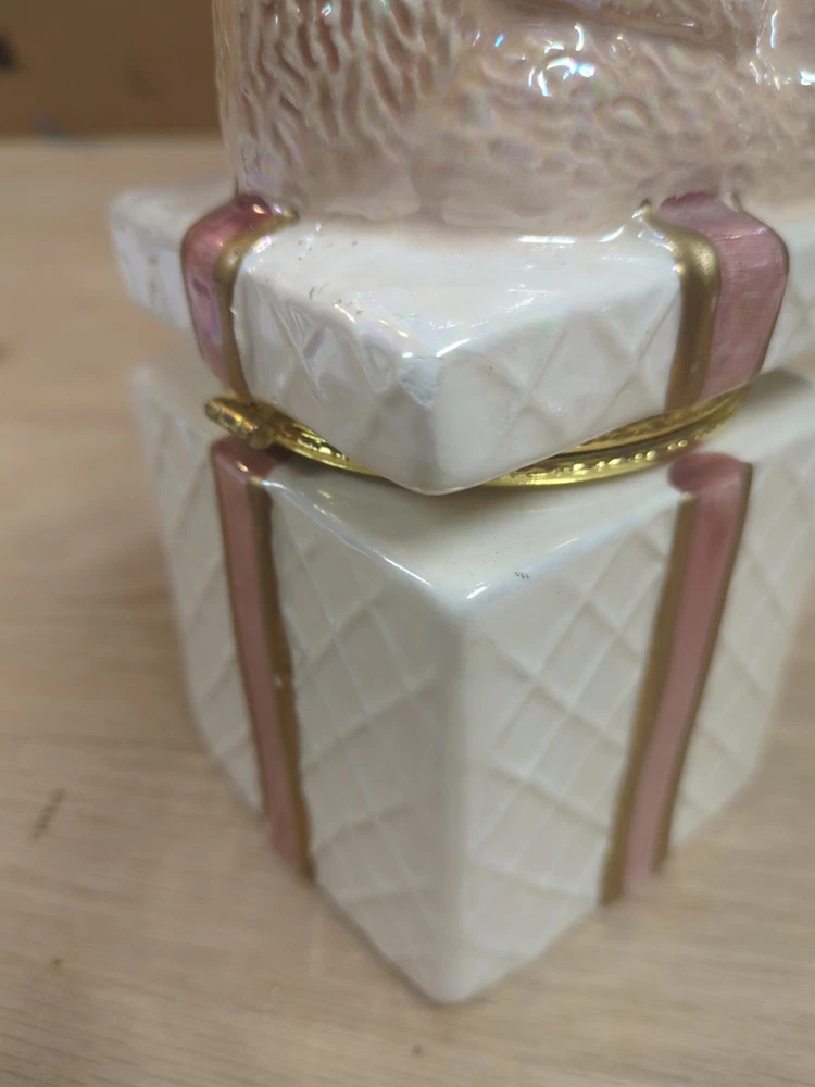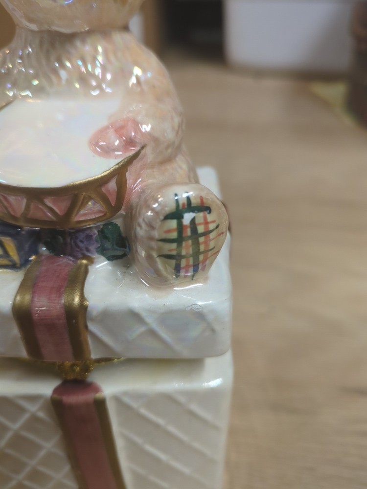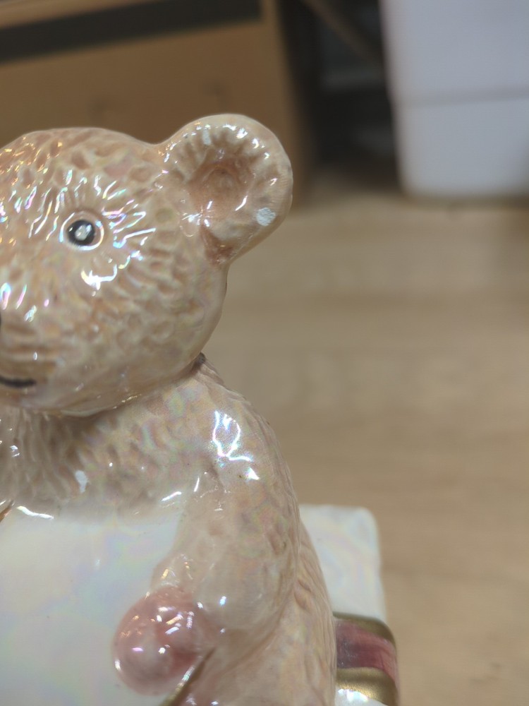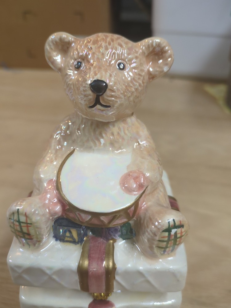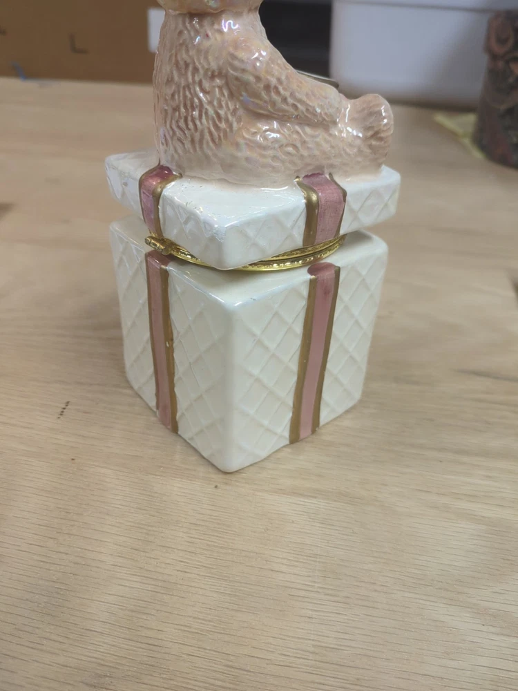 Trinket Gift Box with Teddy Bear Gold Trim HAS CHIPS. Condition is Used. Shipped with USPS Ground Advantage.