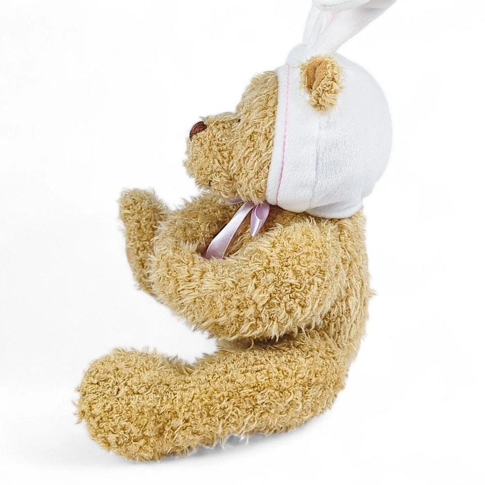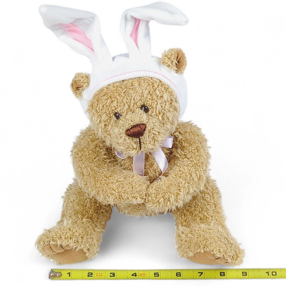 Plush Stuffed Easter Teddy Bear • Brown Bear wearing white bunny ears • Flexible wire in the ears allows you to bend and shape the ears into place • Ear headpiece is tied around the neck with the ribbon, but the bow is attached to the bear's neck and therefore the ear headpiece is not removable • Paws are connected together in front • While seated, bear itself is approximately 9" wide and 8" tall not including ears -- add another 4.5" with ears This is a pre-owned, used item in good condition. No stains, holes, or loose seams.