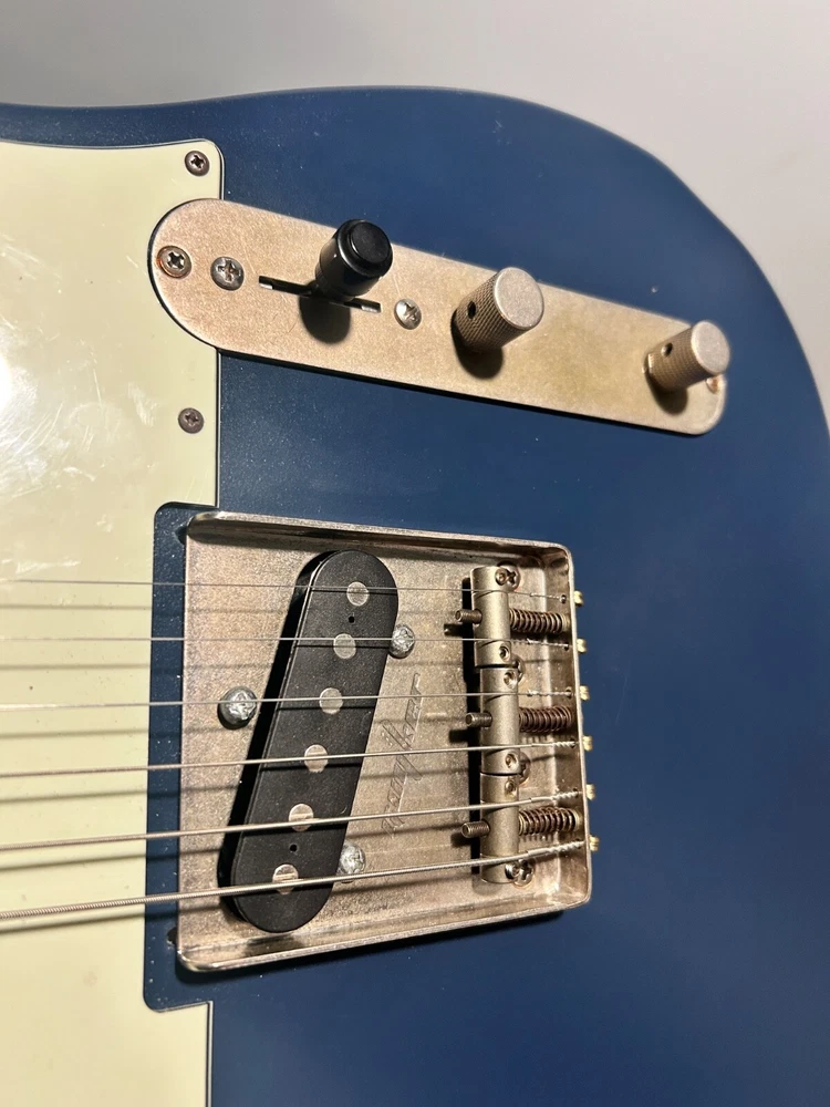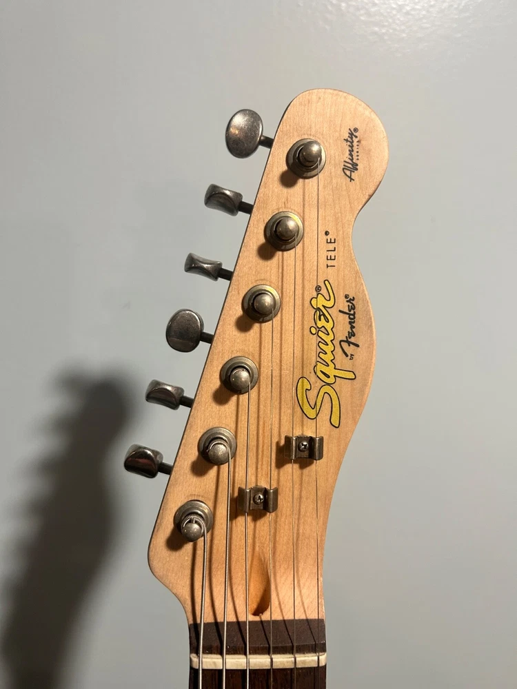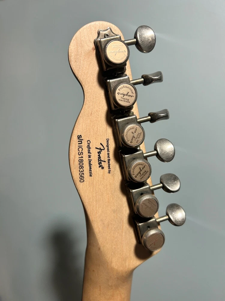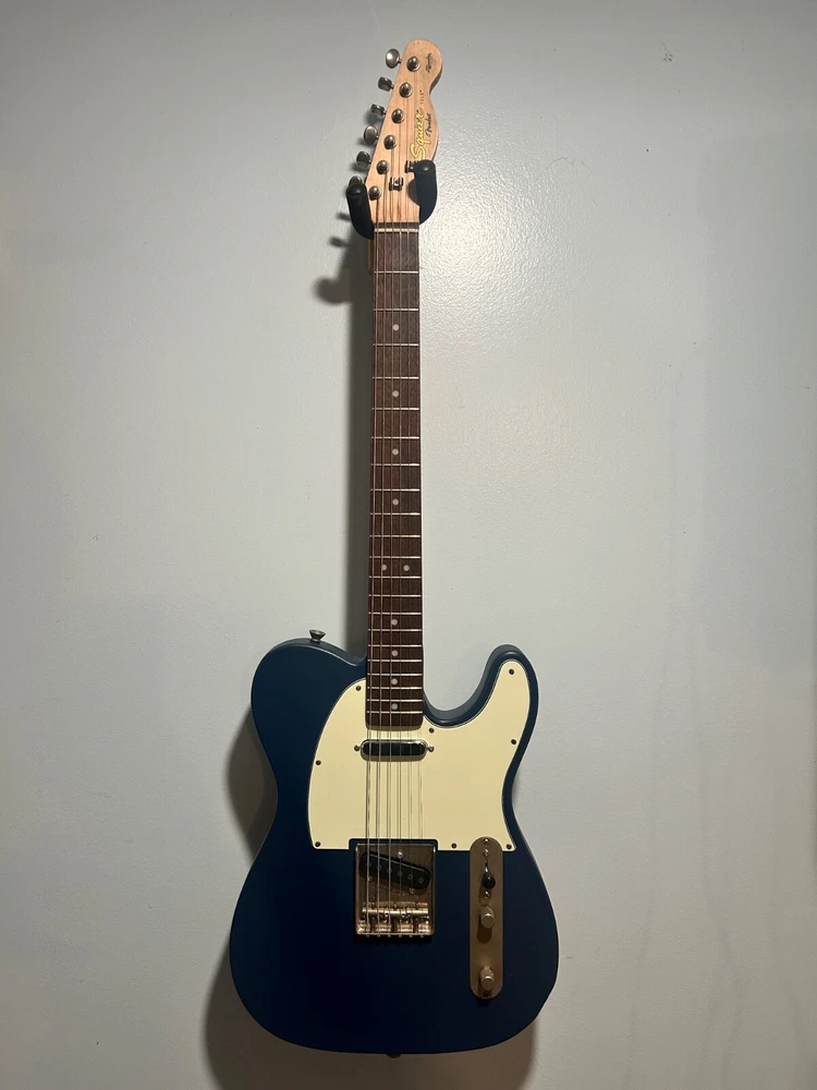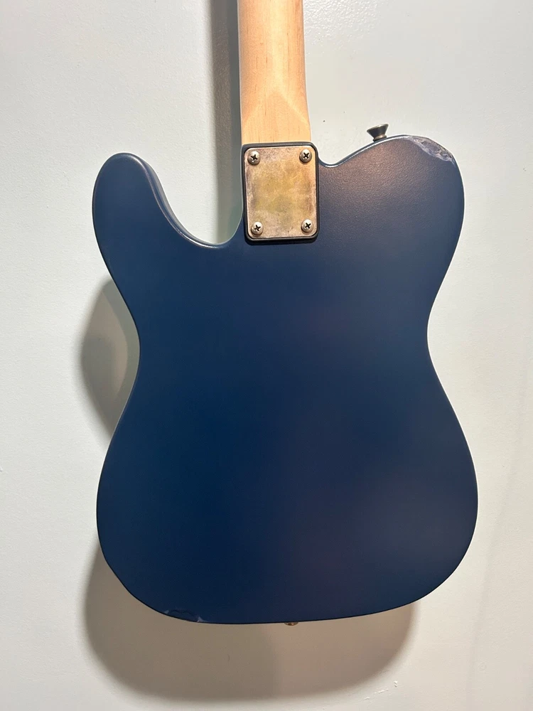 Rescued a stock Squire Affinity, disassembled, cleaned, stripped, re-painted, reassembled. Installed all new hardware. All hardware matches and is Guyker. Locking tuning machines, Reinstalled stock neck and bridge single coil pickups. Reinstalled stock potes and switch. Installed all new Ernie Ball Slinky strings I set up the neck by doing a really good truss rod adjustment, then I adjusted the action to get really good playability, then I set up the intonation for E major standard tuning. You might ask, why would I get this when I can just go get a stock affinity? And you can, but it won’t be this dark navy color you hoped you would find in a tele that none of the stores seem to have, it won’t have this hardware in the rustic, distressed dark brass-ish tone you’ve been toying around with getting but never got around to it so I did it for you, and it won’t be set up like this. if you buy this, I will set it up for free for life if it needs, just bring it in. A superb gateway into the time-honored Fender family, the Squier Affinity Series Telecaster delivers legendary design and quintessential tone for today's aspiring guitar hero. This Tele features several player-friendly refinements such as a slim and comfortable "C"-shaped neck profile. Loaded with dual Squier single-coil Tele pickups with 3-way switching for genre-defying sonic variety, this model is ready to accompany any player at any stage. Body: Poplar Neck: Maple Finger board: Indian Laurel Pickups: standard single coil Tele Pick guard: 3ply white (greenish tint)