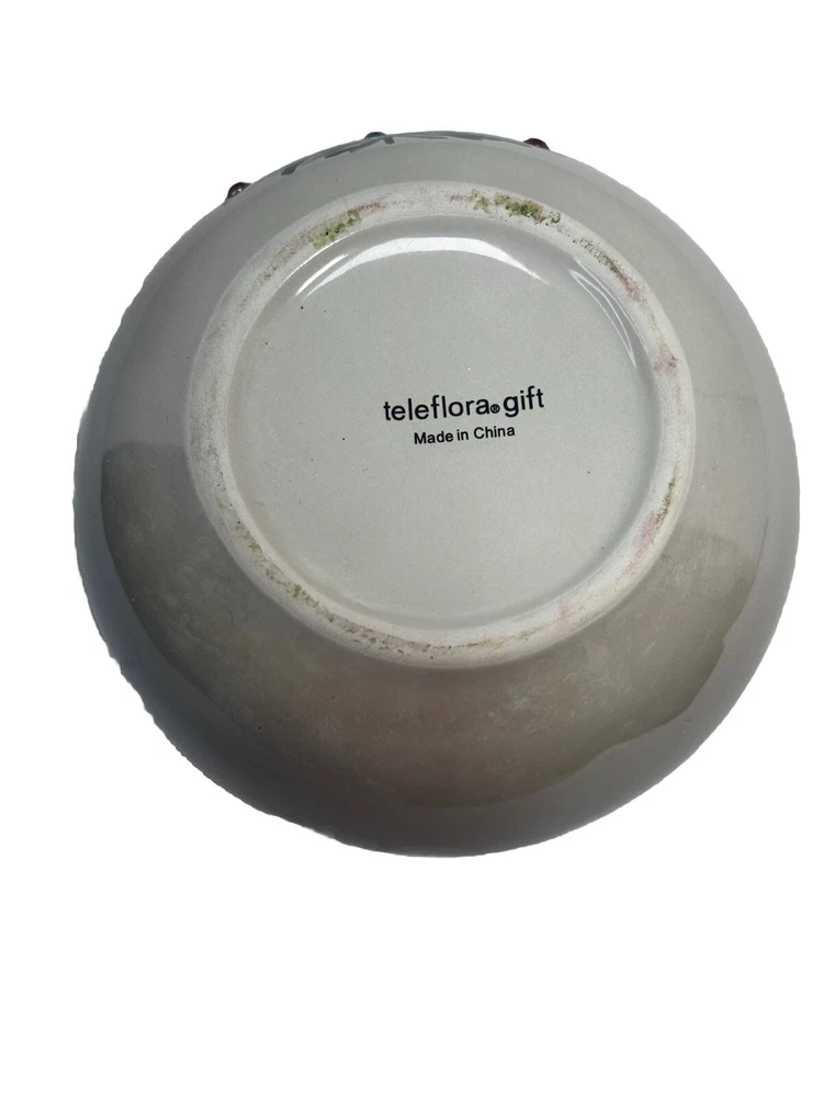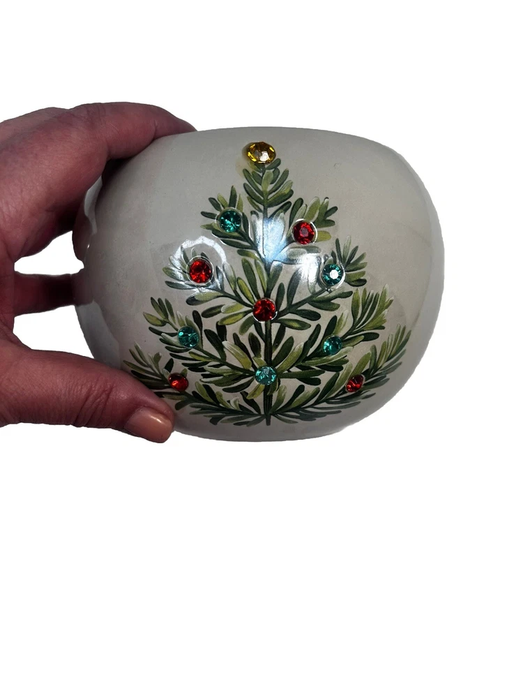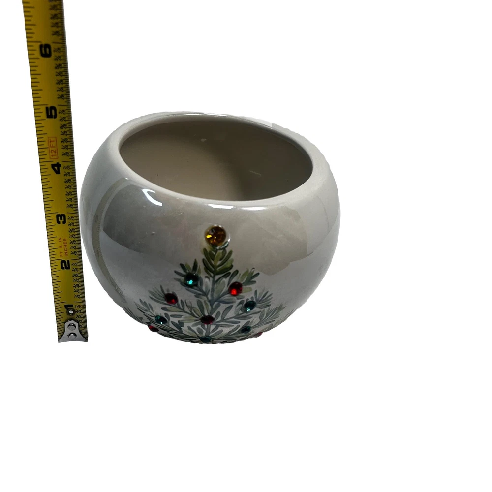 This Teleflora Christmas ball shaped planter is a festive and colorful holiday collectible. Made of ceramic in China, it features a Christmas tree design etched with jewels, adding a touch of sparkle to your holiday decor. The multicolor design is perfect for adding a cheerful touch to your home during the Christmas season.