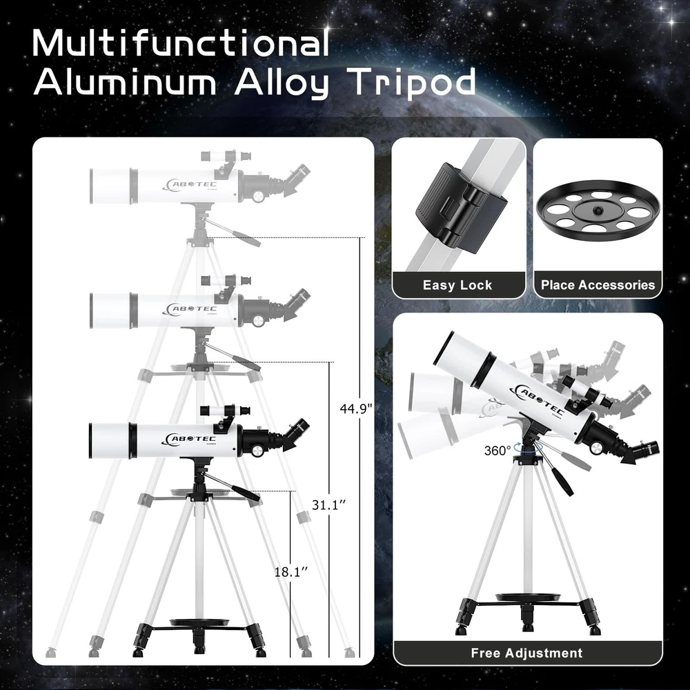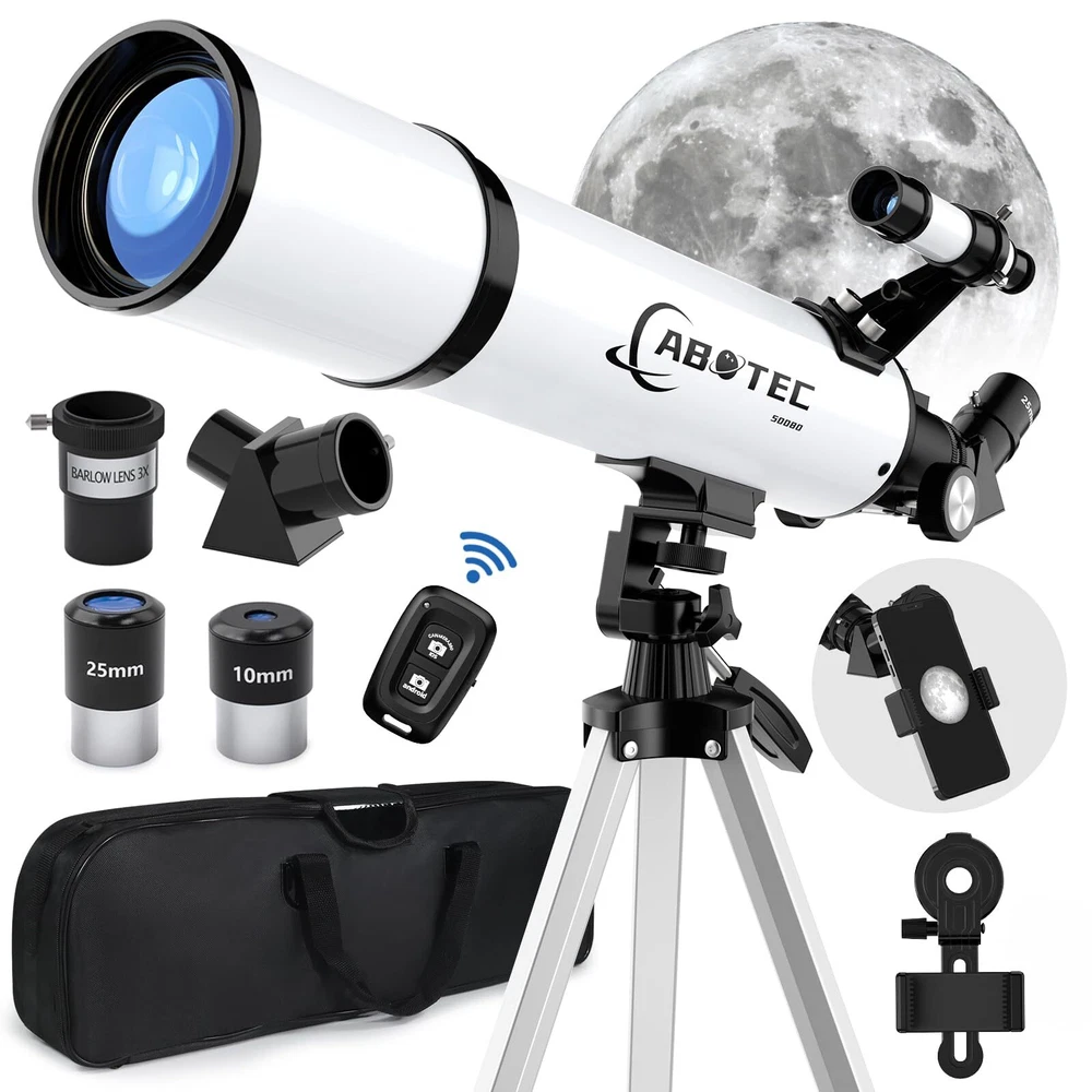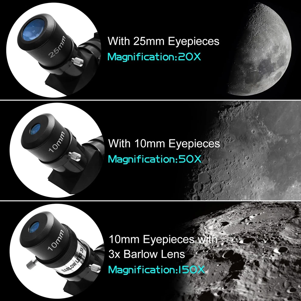 80mm Objective Lens Our telescope is equipped with a large 80mm objective lens and the lens is fully coated with high transmission coatings. The large aperture can collect more light and the high transmission optics lens can increase light transmittance and reduce the reflection of light. Compare with other 70mm models, our telescope can get brighter and clearer images. Professional telescopes for adults astronomy can help 8-12 kids & adults & beginners view the planets and stars more easily. High Magnification The telescope has 25X-250X magnification. Our telescope with 500mm focal length, 3 eyepieces(K25mm, K10MM and K6mm) and a 3X Barlow lens. The 3x Barlow lens trebles the magnifying power of each eyepiece. So you can get magnification from 25X to 250X. The magnification is enough to see the moon and planets. It’s a great telescope for adults and astronomy beginners. Portable Telescope for Travel The refractor telescope has a bag and an adjustable tripod. The tripod is stable and it can be adjusted from 22” to 48’’. The tripod also has a tray, which is convenient for you to replace and store eyepieces. All accessories can be put into the bag, which is convenient for you to carry when you go out and travel. Our telescope set also includes a smartphone adapter and a wireless remote. The phone adapter is the latest, which can let your phone attach to the telescope more stably, so you can take some photos easier through your phone. Easy to Assemble and Use This telescope is quick and easy to set up. We have a full set of manual and a video installation guideline. Don't worry about any installation problems. Even the kids and astronomy beginners can install it by themselves without any tools. It’s a great astronomy gift for astronomy beginners. 3 Years Customer Service provide a 3-year customer service. If you have any question about the products and service, please feel free to contact us, we will do our best to help you in 24 hours. 【80mm Large Aperture】The telescope has an 80mm aperture and a fully coated optics lens. The big aperture can capture more light, the high transmission optics lens can improve light transmittance and reduce the reflection of light, so the telescopes for adults astronomy will bring you more bright and clear images. 【25X-250X High Magnification】The telescope equipped with 3 eyepieces(K6mm, K10mm, K25mm) and a 3X Barlow lens. The 3x Barlow lens trebles the magnifying power of each eyepiece. You can get 25X-250X high magnification with a 500mm focal length. Whether observing moon or viewing planets, our telescope can meet your all needs. It’s a great telescope for adults & 8-12 kids & astronomy beginners. 【Portable & Stable】Our refractor telescope has a bag and an adjustable tripod. All accessories can be packed into the bag, which is convenient for you to carry out. The tripod is stable and the height can adjust from 18.1” to 44.9’’, which can be used in many different viewing positions. The tripod also has a tray for easy replacement and storage of eyepieces. 【Easy to Use】 The telescope is easy to assemble even for astronomy beginners and kids. We have the detailed installation manual and video installation instructions to teach you. Our telescope set includes the upgraded phone adapter and wireless remote. The mobile phone can be attached to the telescope more stably, which is convenient for you to take some amazing photos through your phone. It’s a great astronomy gift for beginners and it will encourage them to love learning about space. 【Satisfaction Service】We provide 3 years satisfaction service. If you are not satisfied with our product or have any questions, please feel free to contact us to get 24-hour technical support from our expert team.