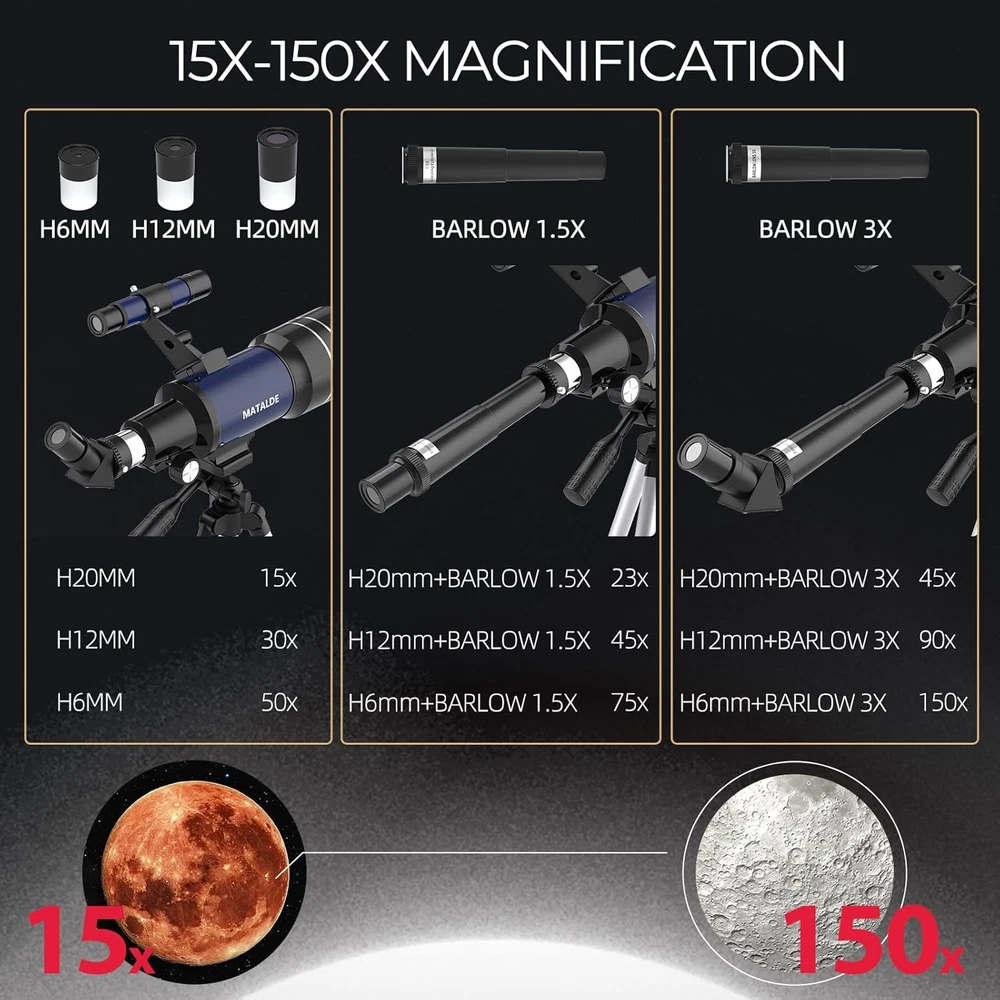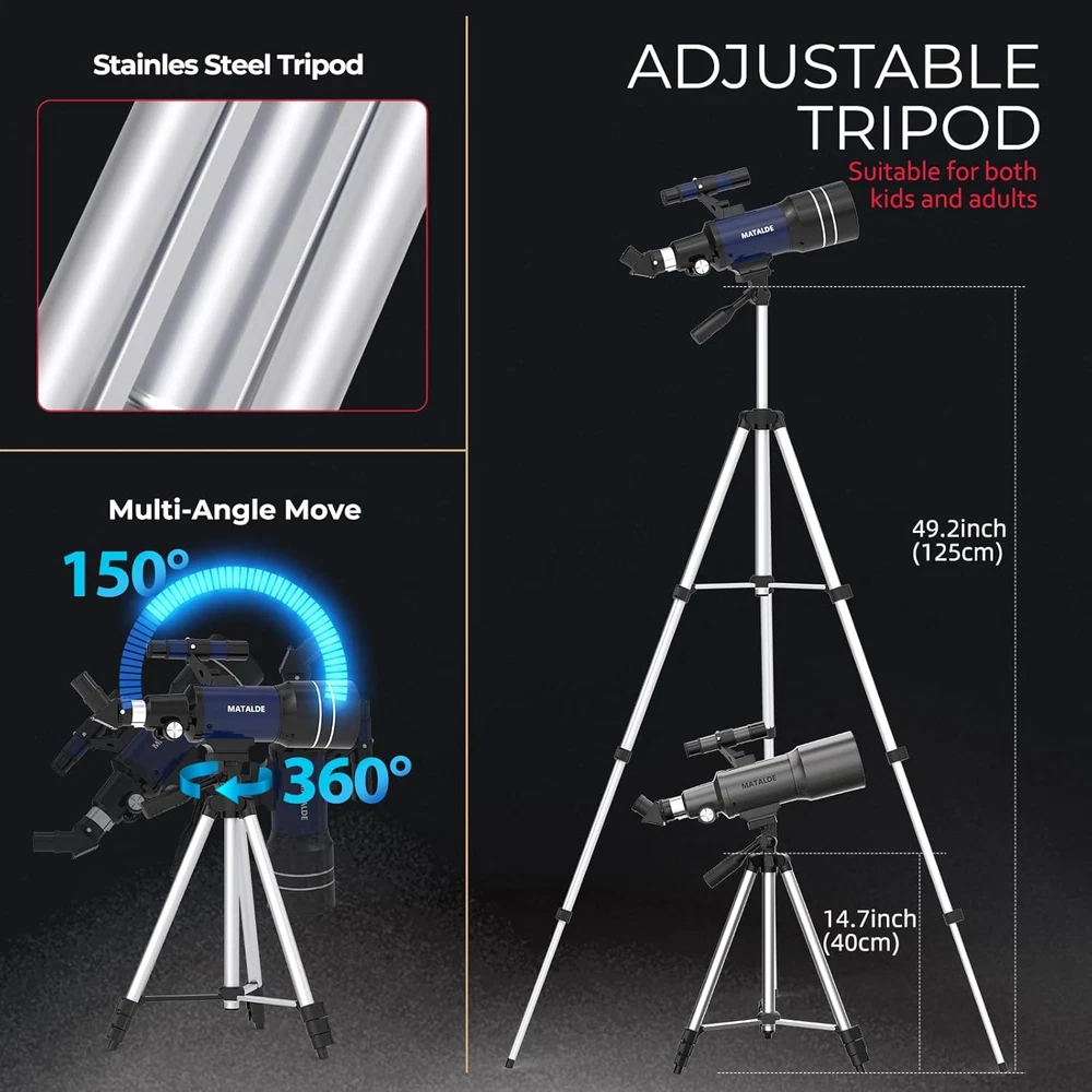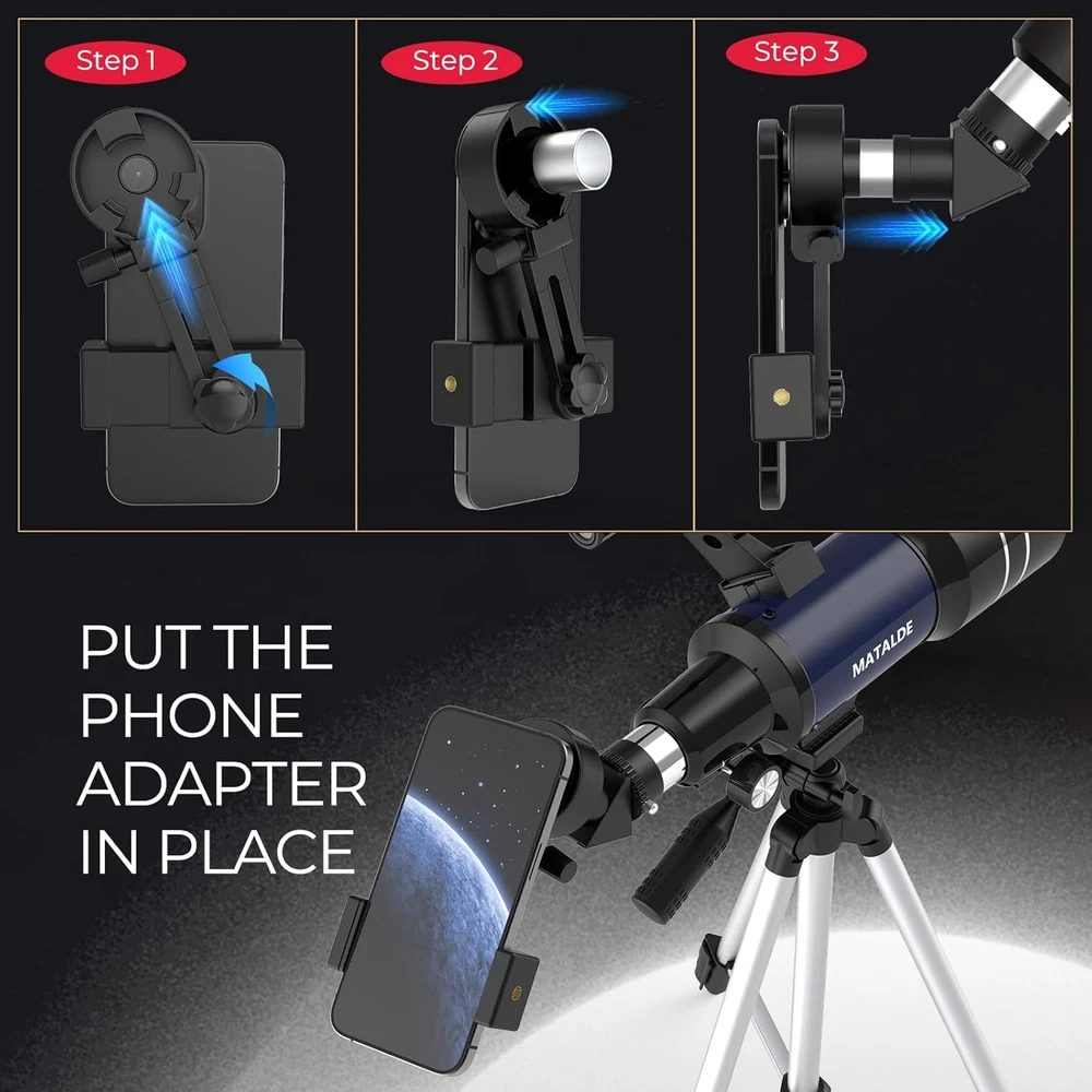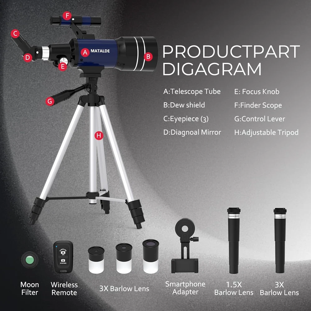 Store New Arrivals Add to Favorite View Feedback Contact Telescope for Kids, 70Mm Aperture (15X-150X) AZ Mount Telescopes for Astronomy Beginners, Portable Refractor Telescope with Tripod, Phone Adapter and Wireless Remote, Dark Blue Description Optical Tube Length 70 Millimeters Optical-Tube Length 70 Millimeters Eye Piece Lens Description Barlow Item Dimensions D x W x H 13.8"D x 2.8"W x 2"H Color Dark Blue Mount Altazimuth Mount Item Weight 1.7 Kilograms Number of Batteries 1 CR2032 batteries required. (included) Objective Lens Diameter 70 Millimeters Product Dimensions 13.8"D x 2.8"W x 2"H Telescope Mount Description Altazimuth Mount 【15X to 150X Magnification】This astronomical telescope boasts 3 eyepieces (K20mm, K12mm and K6mm), and 3X and 1.5X Barlow lenses, allowing for magnifications ranging from 15X to 150X. Enjoy clear views with a 70mm aperture and fully coated optics glass lens. The lenses also feature scratch-resistant coatings to enhance durability. 【Great Gift for Kids】The kids telescope can be used to observe the Moon and bright planets,but also good for daylight viewing of wildlife. Perfect Christmas or birthday gift for kids 8-12, 5-7 and astronomy beginners. The telescope for adults helps children build interest in astronomy and science, exploring the unknown, enjoy the nature and away from screen. 【Easy to Assemble and Adjust Viewing Angle】Assembling the space telescope is a breeze, even for beginners and kids. We provide a detailed installation manual and video instructions to guide you. The adjustable tripod ensures stability and can be set at heights ranging from 13.5 to 47.6 inches, accommodating various viewing positions. 【Wireless Remote & Phone Adapter& Moon Filter】Our telescope for kids & adults comes equipped with a smartphone adapter and a wireless camera remote for seamless connectivity. Simply attach your phone to the adapter, connect it to the eyepiece, and start capturing breathtaking images while exploring the wonders of nature. The included moon filter enhances your observation experience by providing brighter, clearer views of the moon while protecting your eyes from glare. 【Quality and Satisfaction Guaranteed】: Our beginner telescope is perfect for stargazing, birdwatching, and exploring wildlife. With a commitment to your satisfaction, we offer a 2-year warranty and 24-hour technical support from our expert team. You can confidently explore the cosmos with our reliable product. Product Description The video showcases the product in use. The video guides you through product setup. The video compares multiple products. The video shows the product being unpacked. 1 Multi-Angle Rotation 2 Phone Holder Setup Steps 3 45° Diagonal Mirror 4 Moon Filter 1 15X-150X Magnificatons 2 Large Aperture 1 Adjustable Tripod Tube 2 Finder Scope 3 Diagonal Mirror 4 Three Eyepieces 5 3X Barlow Lens ABOUT US We offer the best prices around on high quality products. Our E-store includes media such as books, movies, music and games while offering electronics, toys, sporting apparel, clothing, tools, general home, garden items and more. SHIPPING We are always working hard to ensure your package arrives as soon as possible. Please understand that some factors like weather, high postal traffic, and the performance of shipping companies are outside of our control. We offer free shipping to the lower 48 states and ship within 2 business days of payment, usually sooner. We do not accept P.O. Boxes. Please provide a physical address. For shipping outside of the continental USA, we only use eBay's Global Shipping Program.The item is shipped to KY and then sent to the rest of the world. International customers are responsible for all duties and taxes. Continue to check out in order to calculate costs for shipping the item to your country. Messages regarding eBay's Global Shipping Program MUST be directed at eBay EXCLUSIVELY. RETURNS We offer a 30-Day Return Policy on items which you are not completely satisfied with. You have the option for a full-refund or an exchange of the item. No returns are available on items shipped outside of the USA. PAYMENT We accept PayPal. CONTACT US This page content is yet to come Please ad us to your favorite seller and visit again later Thank You CUSTOMER SATISFACTION We try our very best to make sure every customer is completely satisfied. If there's a problem, message us! We're happy to help. WE ACCEPT Copyright © 2021 AutoDS. | All Rights Reserved