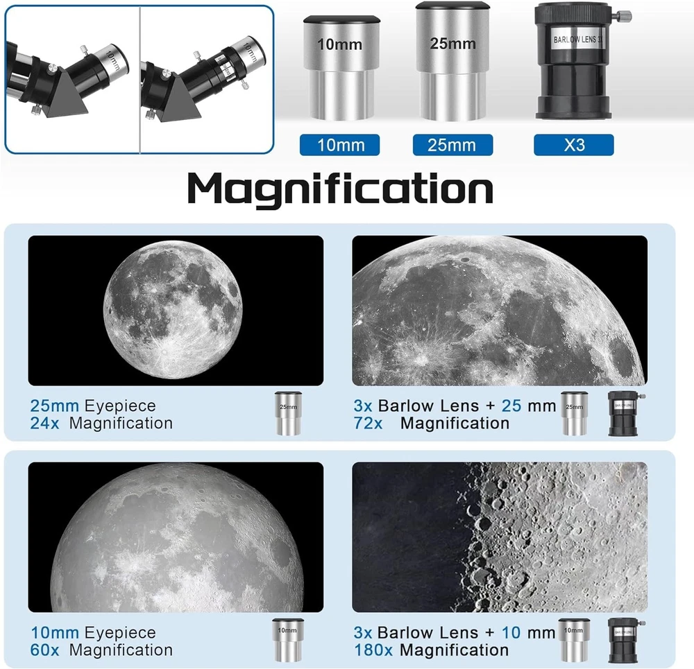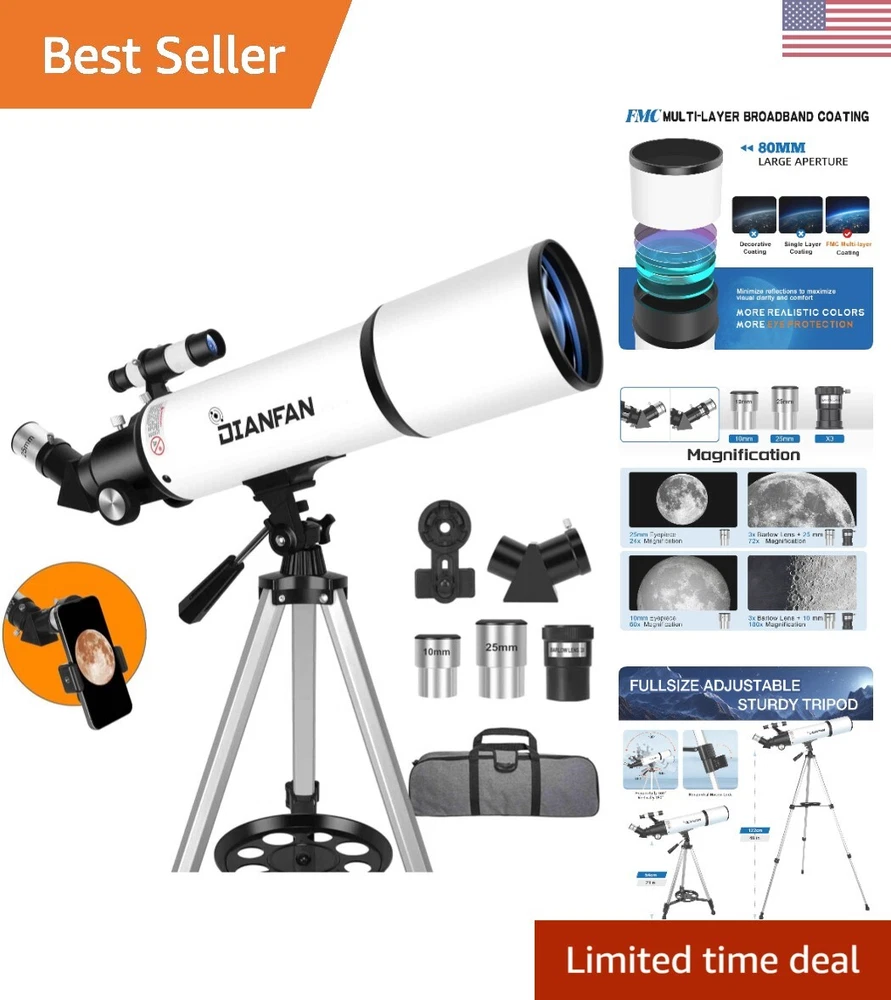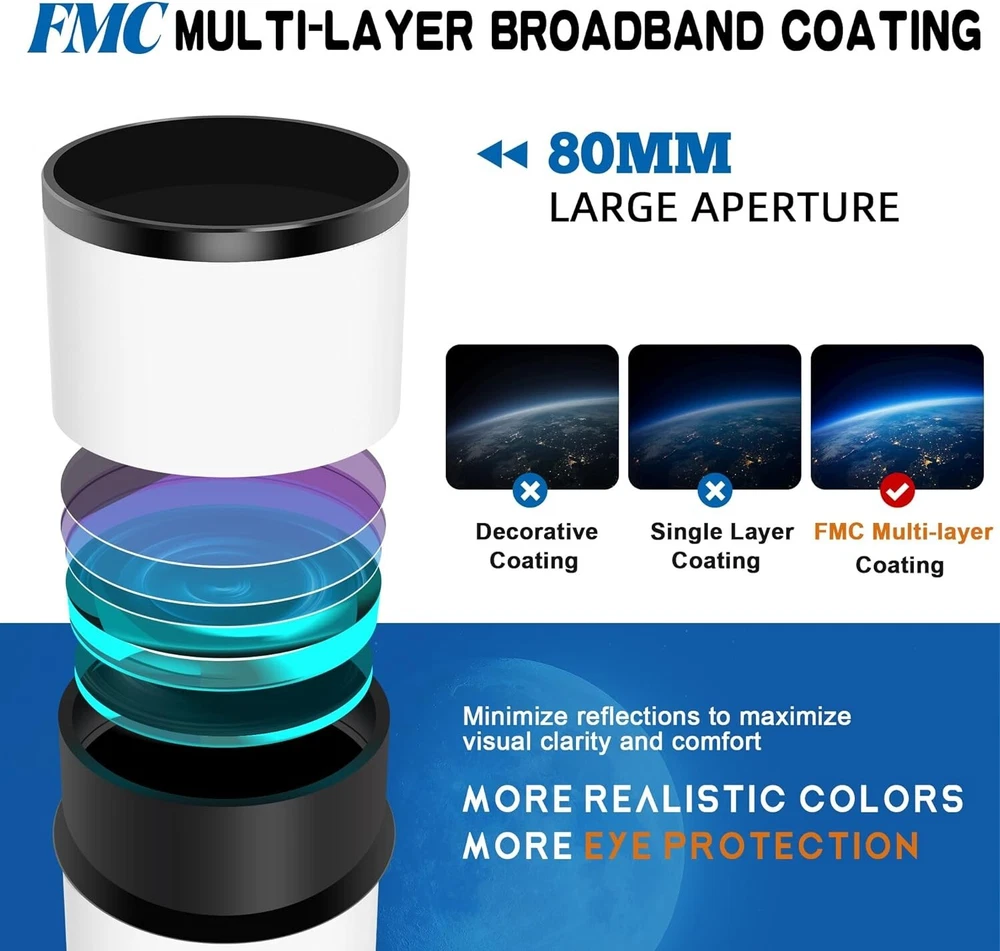 Telescope,80mm Aperture 600mm Telescopes for Adults Astronomy,Fully Mult-Coated High Powered Refracting Telescope for Kids Beginners,Professional Telescopes with Tripod, Adapter and Bag [High-quality Optics]: 80600 telescope uses superior optics to provide clear and realistic views,designed with FMC multi-layer broadband high transmission coated. More realistic colours for maximum eye perfect for stargazing and astronomy enthusiasts. [Large Aperture High Magnification]: The Astronomical telescope is 600mm(f/ focal length and 80mm large aperture.Equipped with two excellent-quality eyepieces (25mm and 10mm)and a 3X Barlow 3X Barlow lens triples the magnification of each can get magnification from 24X to 180X. [Sturdy Construction]: With durable aluminum frame and stable tripod, this telescope is built to last and can withstand s of use and travel.Compact design and lightweight construction,it is easy to simple controls ensure that you can start observing the night sky right away. [Home Education Preferred]: This is the first choice for quality home education.Develop your child's hands-on and observation skills away from mobile telescope is designed to be user-friendly, with a straightforward assembly process make it easy to adjust and focus. [Quality Service]: Our telescope is designed for starry sky watching, birding watching, wildlife watching, trip,city watching.Believe in and choose telescope. contact me if you encounter any problem, we promise you will get a satisfactory answer within 24 hours.