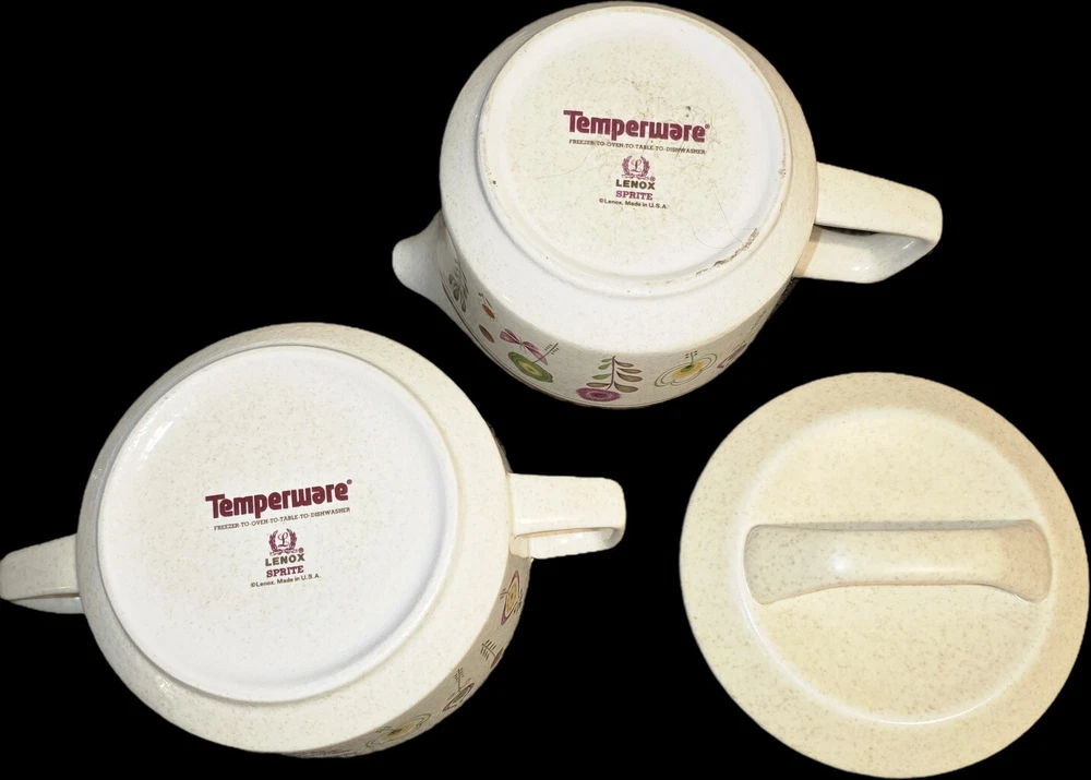 This is a 3 piece set Lenox Sprite Temperware. It appears to be a creamer or gravy serving bowl and a sugar bowl w a lid included. All three are in excellent condition, with no chips or cracks! Temperware is unique as it is made to go from oven to freezer or cold to hot without cracking or breaking! Would be a great addition to any kitchen!