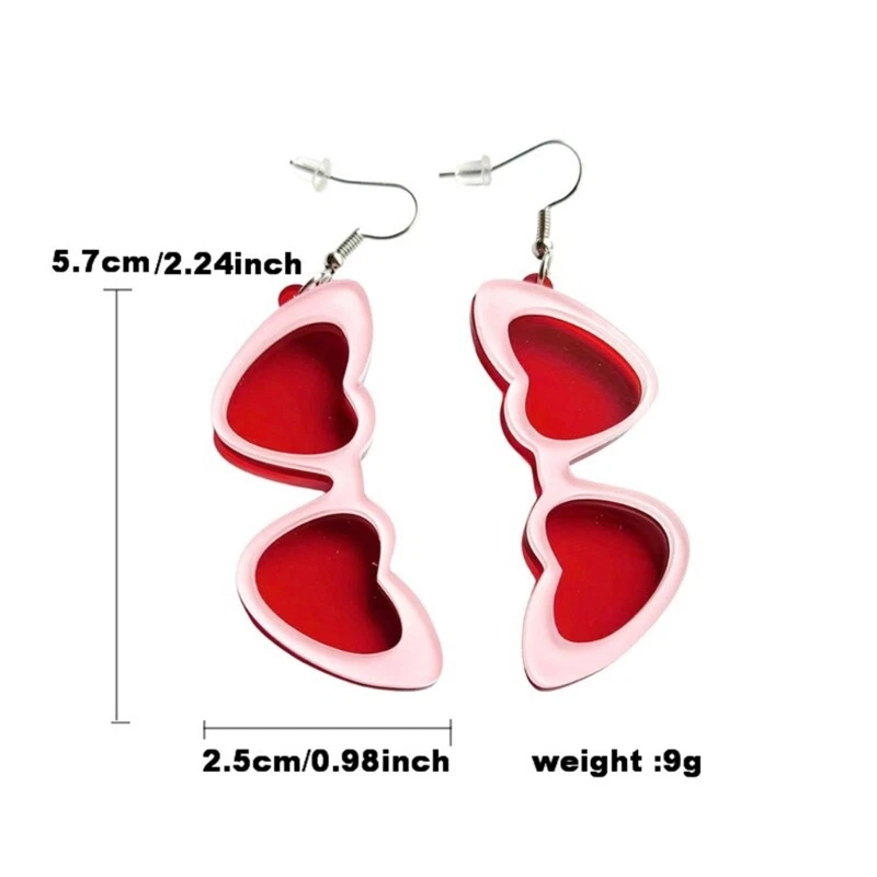 Features: These heart shaped sunglasses are for those who love unique designs Made with Acrylic+Alloy, they are lightweight and comfortable to wear. With their eye catching shape, these earrings add a touch of charm to any outfit. Available in various colors, they cater to different preferences. Designed for individuals who appreciate individuality and want to showcase their these earrings are for those who love to stand out from the crowd. Whether it's for everyday wear or special occasions, these earrings complement any look. They are versatile enough to be worn with casual outfits or dressed up for parties and gatherings. Add a touch of uniqueness to your accessory collection with these earrings. Their exquisite and attention to detail make them a choice for anyone looking to show their distinct personality. Specifications: Acrylic+Alloy Color: Rose/Bright Red Light Black Size: As shown in the picture Package Includes: 1pair Earrings note: Please allow 1-2cm errors due to manual measurement, make sure that you do not mind before you order. Due to the difference between different monitors, the picture may not reflect the actual color of the item.
