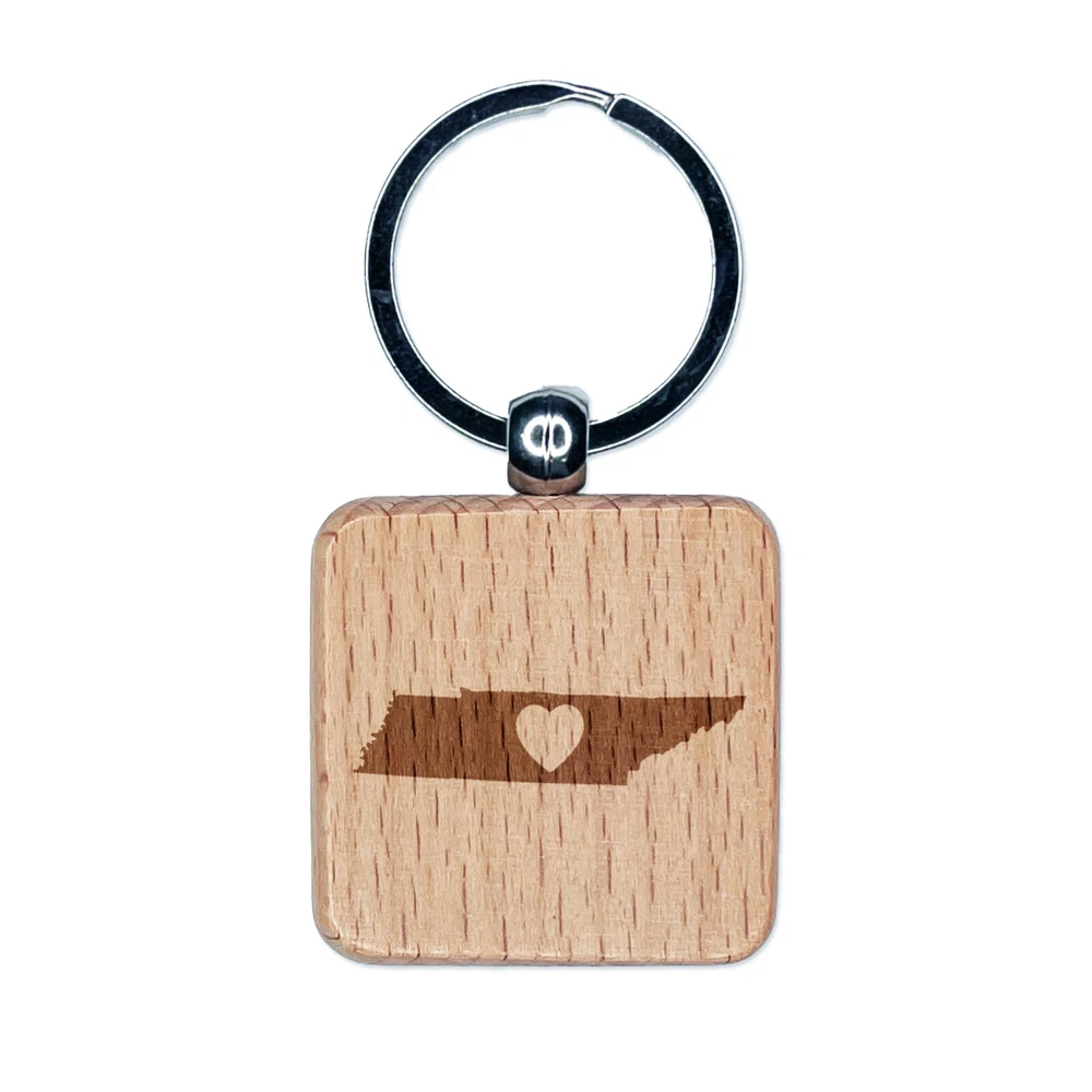Tennessee State with Heart Engraved Wood Square Keychain Tag Charm