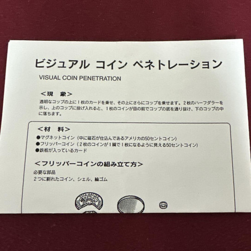 Visual Coin Penetration by Tenyo Description This is one of Tenyo's high-quality coin magic series, boasting the world's best technology. This "Visual Coin Penetration" is a professional magic trick that brilliantly realizes a phenomenon that seems impossible at first glance by luxuriously combining multiple devices and mechanisms. The instantaneous penetration phenomenon that happens right before your eyes is stunningly vivid! At the exact moment the coin penetrates, you, the magician, simply toss the coin back in and do not do anything suspicious. The spectators get to witness the moment when the coin they tossed hits the bottom of the glass, goes straight through the glass, and then the card, and falls into the glass below...! It's truly a "professional miracle"! This product comes with multiple gimmicks, each of which can be used in a variety of different ways for other magic tricks. Therefore, this is not just "one magic tool," but can also be thought of as "a basic tool set for performing authentic coin magic." Combining these tools to create the "most effective procedure" is the performance known as "Visual Coin Penetration." The quality (degree of precision machining) of a trick coin is crucial, and this greatly influences the success rate of the performance. We recommend that you have a collection of high quality basic trick coins, as you will likely use them frequently in various performances in the future. *Please prepare your own coins and rubber bands. Also, please prepare your own magnet cards and coins. Please be sure you fully understand this before purchasing. List price: 13,200 Payment We only accept PayPal payments. Please pay within 5 days after auction is finished. Term of Sale Money back guarantee within 14 days if returned by customer. We offer 14 days money back guarantee for defective products. However the buyer must pay money for returning it back to us. About Us A specialty shop offering a wide variety of carefully selected Japanese brand items. Unless marked "used" all of our inventory is brand new, so you can feel confident about your purchase. Even if you think to yourself, "But the item I want is only available in Japan.", make sure to consult with us before giving up hope. We will look for and suggest the best products on your behalf. International Buyers - Please Note Import duties, taxes and charges are not included in the item price or shipping charges. These charges are the buyer's responsibility. Please check with your country's customs office to determine what these additional costs will be prior to bidding/buying. These charges are normally collected by the delivering freight (shipping) company or when you pick the item up - do not confuse them for additional shipping charges.