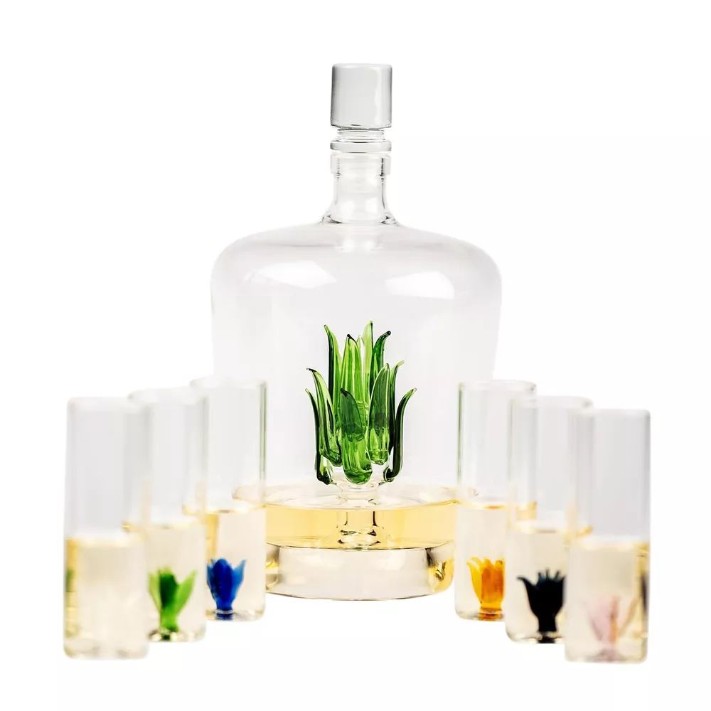IMPRESS YOUR BAR SET WITH AGAVE STYLE WITH THIS LARGE WHISKEY AGAVE DECANTER: This TEQUILA decanter is Great as a starter of finishing touch for any bar. This is a hand crafted carefully constructed TEQUILA decanter with AGAVE glasses, will make anyone admire the artfully detailed agave shape spirits decanter. SIZE: 750mL Decanter, 3oz shot glasses. ARTISAN CRAFTED - AN ABSOLUTE MUST FOR THE CONNOISSEUR AND SAVANT: Every bar should have this impressive display decanter and glasses.This decanter set with agave glasses is a must have for the adventurer or the true connoisseur BEAUTIFUL AGAVE DECANTER AND SHOT GLASSES: The hand crafted glass agave plant displays the Tequila plant with 6 agave shot glasses are a beautiful match, pair with your favorite Tequila scotch, whiskey, wine or port PERFECT GIFT: Makes for a great gift for any occasion, Birthday, Anniversary, Valentines day, Love, Husband Boyfriend home welcoming gift or just because!