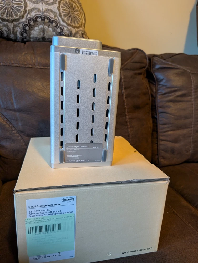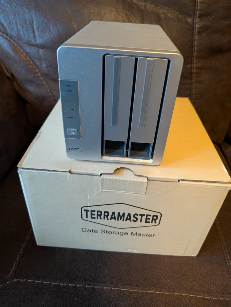 The Terramaster NAS F2-221 is a compact and can hold 2, 3.5" or 2.5" drives that offers a silver unit with a 3.5-inch form factor. It has dual Gigabit Ethernet capabilities The NAS features a media player, auto power on/off, password protection, duplication, secure encryption, remote access, and temperature sensor. It also includes a 4TB disk and has been upgraded with 10GB of RAM. The unit is compatible with PC and Mac and has a low noise level. Additionally, it has a USB 3.0 specification, indication light, cloud storage, and a removable drive cartridge.