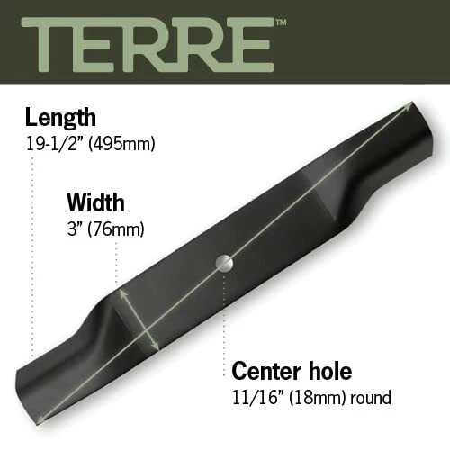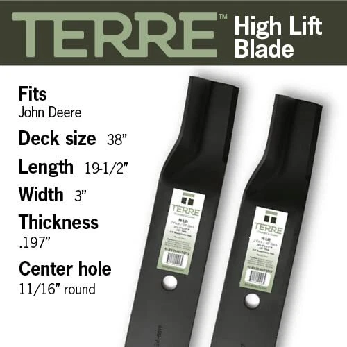 Length: 19-1/2" | Width: 3" | Thickness: .197" | 11/16" Round Center Hole | 38 Inch Deck | 3 Pack High Lift Blades Replacement for John Deere AM100991, AM100945, AM137324, AM137326, AM141041 Replacement for John Deere: M153118 , M83459, M84472, N154159 | Lesco: 050537 Compatible with John Deere 38 Inch LX Series: LX172, LX176, LX178 | John Deere 38 Inch Lawn and Garden Tractors: LT133, LT150, LT160, LT165, LT240, LT245, STX38, GT242 Compatible with Sabre: 1338GS, 1538H, 1538HS, 1638HS