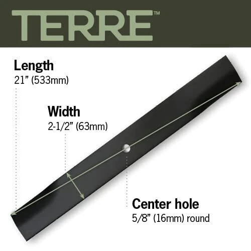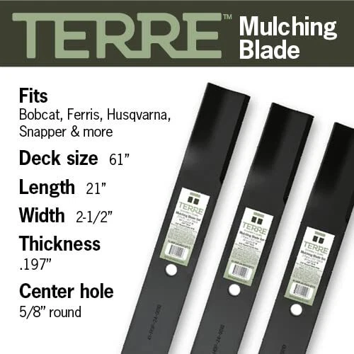 High-quality exact replacement mower blades for Compatible/Replacement for Husqvarna OEM part #s 539101733. Replaces OEM Part Numbers: AYP 539101733; Bobcat 112111-03, 112243-03, 2722543-03, 42180B, 72039B, WM142180B Replaces OEM Part Numbers: Giant Vac 0788; Husqvarna 539101733; Kees 101733 Replaces OEM Part Numbers: Lastec P-128; Ransomes WM142180B; Snapper 1520842, 1-7081, 5020842, 7017081, 7075770, 7075770BZYP, 7075770YP Compatible with: 61" Decks Husqvarna BZ6127, BZ6134, iZ6123, iZ6125, LZ6123, LZ6125, LZ6127, LZ6130, WHF6123, ZTH6123, ZTH6125, ZTH6126, ZTH6127; Bobcat with 61" Decks XM Series replacement for 5020842, 539101733, 112111-03, 112243-03, 2722543-03, 42180B, 72039B, WM142180B, 0788, 101733, P-128, 1520842, 1892324, 7017081, 7075770, 7075770BZYP, 7075770YP. Terre (formerly Phoenix Distribution) is your source for genuine, affordable OEM replacement and general-purpose mechanical motion parts and outdoor power equipment. The quality of our products and our service is at the root of all we do. Length: 21" | Width: 2-1/2" | Thickness: .197" | 5/8" Center Hole | 61 Inch Decks | 3 Pack High Lift Blades Replaces OEM Part Numbers: Scag 48111, 481708, 481712, 48304, A48111, A48304 | Ferris 1520842, 1520842S, A48304 | Husqvarna 539101733 Replaces OEM Part Numbers: Bobcat 112111-03, 112243-03, 2722543-03, 42180B, 72039B, WM142180B | Snapper 1520842, 1-7081, 5020842, 7017081, 7075770, 7075770BZYP, 7075770YP | Hustler 795252, 795252X, 795252Y Replaces OEM Part Numbers: Giant Vac 0788 | Kees 101733 | Lastec P-128, P-246 | Ransomes 42180B | Great Dane D18036, GDU10232 | Bunton 79-117, PC005, PL4207 | Encore 823006 | Honda 72511-VE6-L10 | Lesco 050170, 50256, 51532 Compatible with 61" Decks for the following models: Scag Advantage | Scag Turf Tiger | Scag Wildcat | Scag Walk-Behind | Simplicity Stallion | Simplicity Colt | Ferris 1000Z | Ferris IS1500ZX | Ferris IS2000Z | Ferris IS2500Z | Ferris IS3100Z | Ferris IS4500Z | Ferris IS5100Z | Ferris G1818