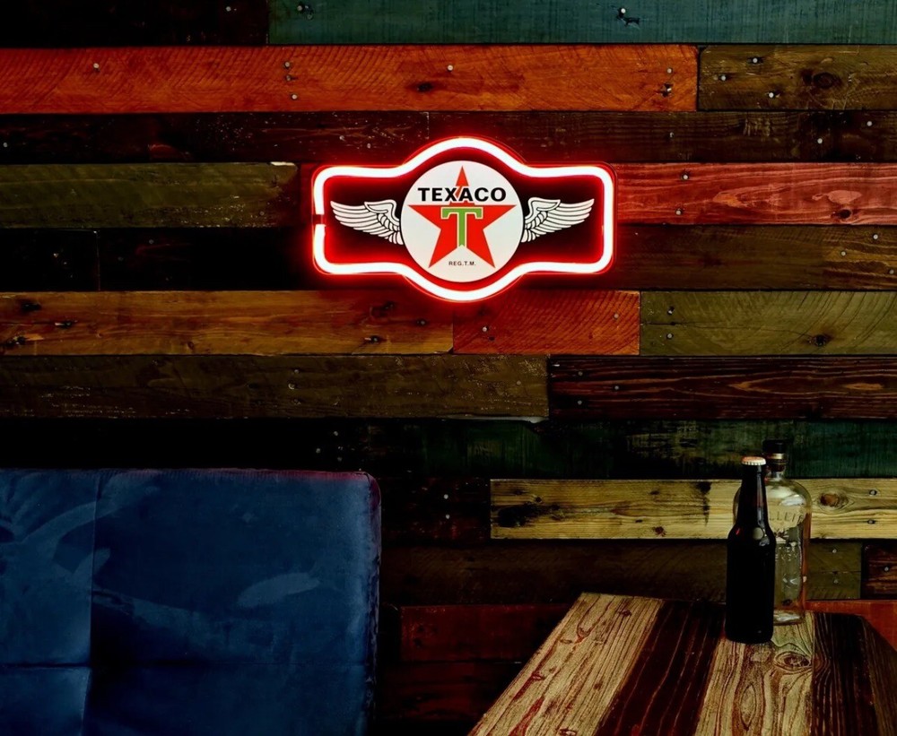 Add a sleek touch to your bar, garage, or man cave with this Texaco LED Neon Sign in a stylish marquee shape. The black color and luminous features make it a perfect addition to any room, while the LED lights add an extra pop of brightness. This bar sign is made with high-quality materials and is sure to catch the eye of anyone who walks into the room. Perfect for Texaco enthusiasts and those who love a touch of vintage charm, this LED sign is a must-have for any home decor collection.