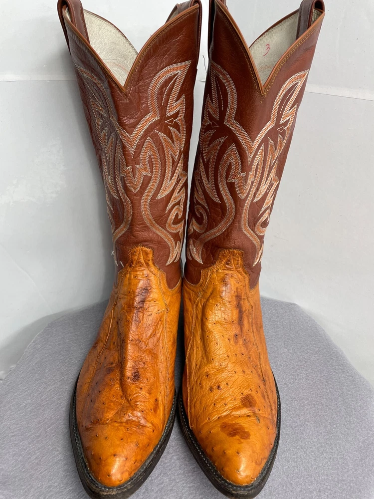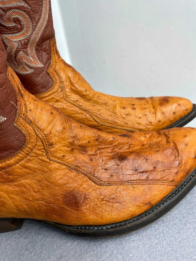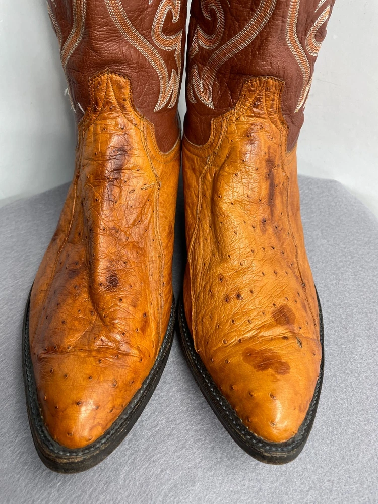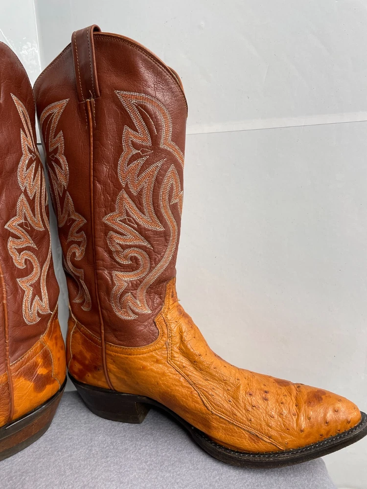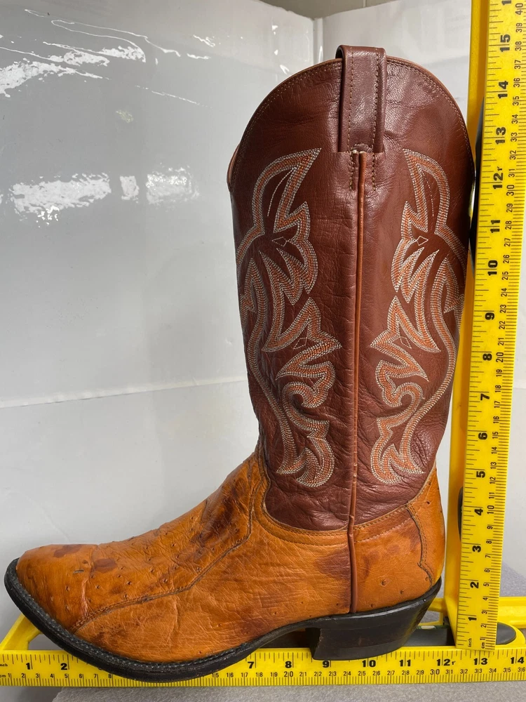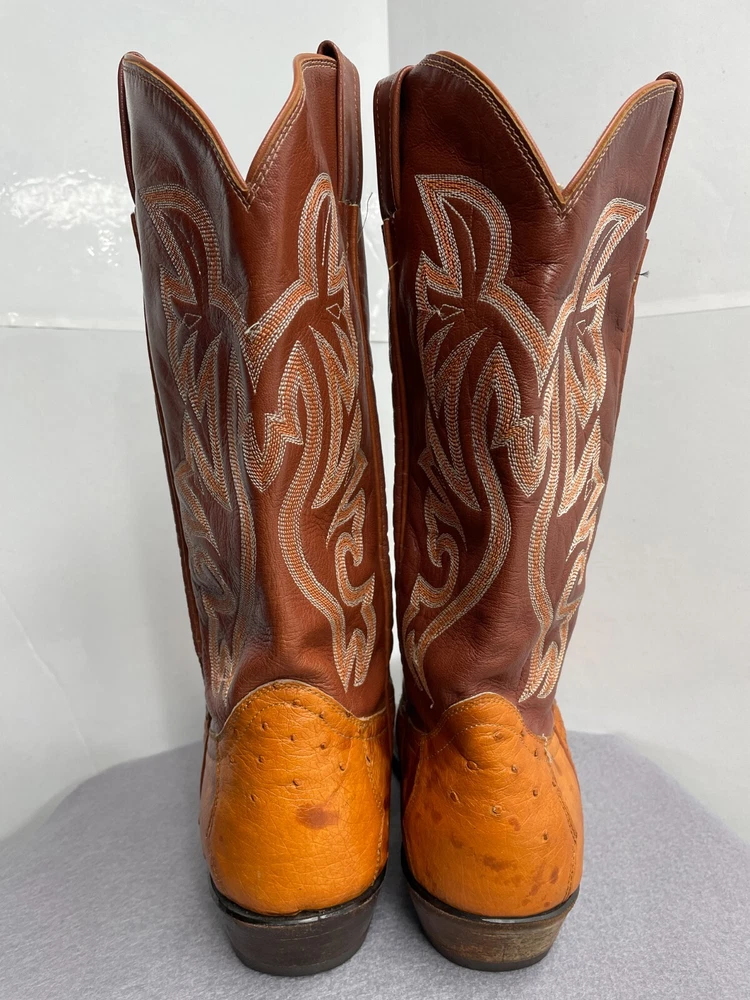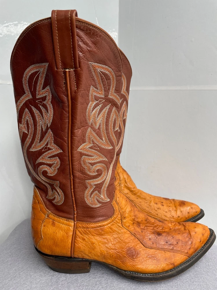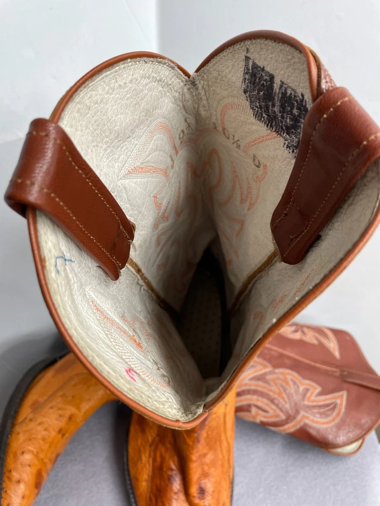 Texas Ostrich Leather Western Boots Cognac Brown Cowboy Embroidered Men's 10.5 D