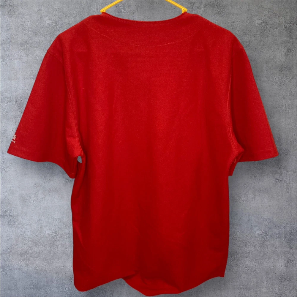 Show your support for the Texas Rangers with this vintage True Fan jersey. The red jersey features the iconic Rangers logo and is officially licensed by the Major League Baseball. It's perfect for wearing during the regular season or displaying as a collector's item. This men's medium jersey is in great condition. Whether you're a die-hard Rangers fan or just love baseball, this jersey is a must-have addition to your collection. Get yours today and show your team spirit!