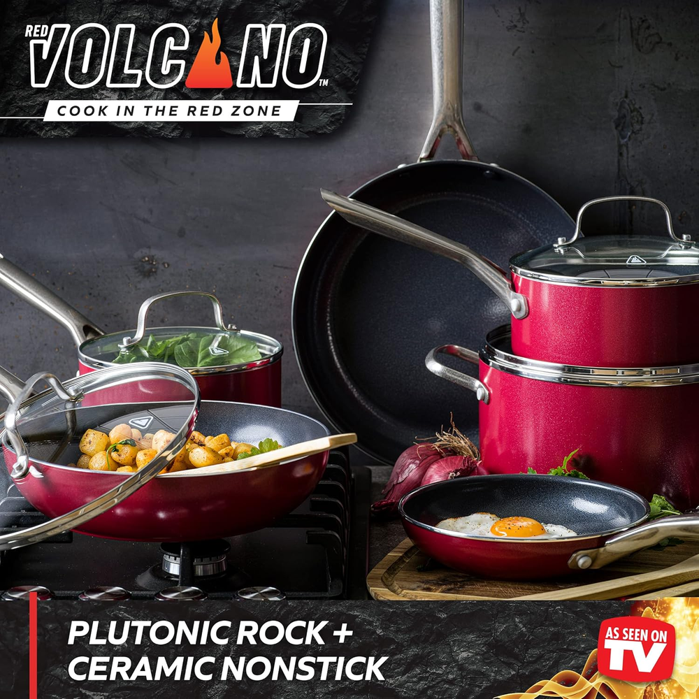 Set includes: 2QT and 3QT saucepans with lids, 5QT stockpot with lid, 7-inch frypan, 5.5-inch frypan, 2.78qt sauté pan with lid Go with the Flow: Unique Lavaflow technology fuses ceramic nonstick with plutonic rock. Plutonic rock is a dynamic substance formed by unbelievable heat and pressure that can stand temperatures up to 1400°F! Cook in the Red Zone: Red Volcano’s textured nonstick spreads oil evenly for better frying, plus it’s 10x longer lasting and heats 5x faster than traditional coatings Toxin-Free: Free of PFAS, PFOA, lead, and cadmium Made from heavy-gauge aluminum for quick and even heating Oven and broiler safe to 600°F; glass lids 425°F Dishwasher safe for quick and easy cleanup For this set, we’ve reached into the depths of the Earth to harness nature’s power. Red Volcano uses Lavaflow technology to fuse ceramic nonstick with plutonic rock, a dynamic substance formed by unbelievable heat and pressure. Each pan has a textured nonstick coating that spreads oil evenly for better frying, plus it’s 10x longer lasting and heats 5x faster than traditional coatings! Incredibly strong and long lasting, plutonic rock can even stand temperatures up to 1400°F! This unique coating is specially designed to transfer heat quickly for unbelievable searing and browning, plus the texture enhances nonstick performance. Free of PFAS, PFOA, lead, and cadmium, this coating is toxin-free so you can cook with worry. Designed for daily life, these pans are metal utensil safe. Heavy-gauge forged bases keep these pans from warping and wobbling. Dishwasher safe for easy cleanup. Cook in the red zone! Set includes: 2QT and 3QT saucepans with lids, 5QT stockpot with lid, 7-inch frypan, 9.5-inch frypan, 2.78qt sauté pan with lid