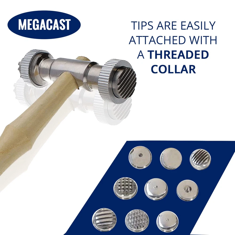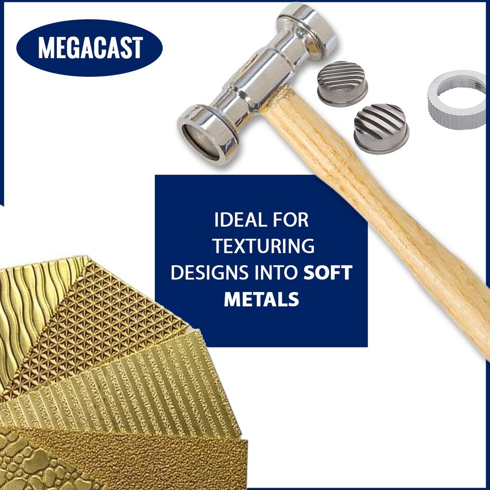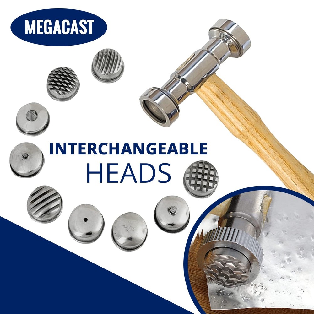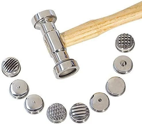Faces Patterns: This Hammer includes 9 interchangeable face patterns (cross-hatch, wide stripes, sharp dimple, narrow stripes, inverted dimple, square dimple, round dimple, diamond & domed plain). Versatility: Whether you’re a professional or beginner this texturing hammer will be a great tool in your arsenal. Use our Texturing Hammer to create custom-made earrings, bracelets, necklaces, and rings. You can also use it in conjunction with embossing hammers to form domed shapes and other patterns on sheet metals. Specification: Material: Steel, Wooden Item type: Texturing Hammer Application: Jewelry Shaping, Metal Texturing Package Dimensions = 11.73 x 3.15 x 1.54 inches Overall length = 9.5” Diameter of each tip ~ 3/4” Head weight = 8 oz. Package Content: 9 x Interchangeable Heads 1 x Hammer Material: Our Two-sided Metal Texturing hammer head is made of high-quality steel and the handle is made of polished wood. This texturing hammer is durable enough to withstand many uses and ensures a quality finished product. Design: This Texturing Hammer comes with 9 Interchangeable heads in different patterns and a polished wooden handle. Each hammer face is securely attached with a threaded collar and it is easy to change heads. Features: The weighted head of the hammer reduces the amount of striking power needed. The ergonomic wooden handle enables a comfortable grip and sufficiently absorbs hammering vibrations to improve striking accuracy. You may use the small designs to pinpoint texture in a particular area and the large designs to cover a bigger area or use multiple tips to layer textures on one another. Application: First, you choose the texture face which you would like to use then unscrew the threaded end on the hammer. After that place the texture face into the threaded ring which you removed from the hammer. Screw the threaded ring back onto the hammer then place the metal you want to texture onto a bench block and strike firmly with the hammer. Usage: This professional texturing hammer is great for jewelers, crafts lovers, and metal-smiths. Each face helps you to create different patterns on malleable metals such as pewter, sterling silver, aluminum, brass, copper, nickel silver, and non-ferrous metals.