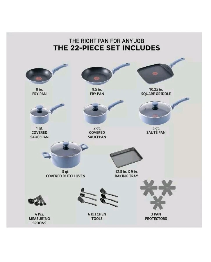 T-fal Excellence Ceramic Non Stick Cookware 10 piece Set Blue New
