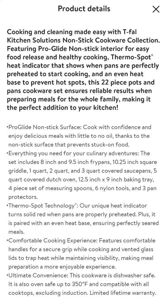 Material:CeramicStove Type Compatibility:VariousColor:BlueBrand:TefalMPN:1760095Type:Cookware Setgtin13:032406069688UPC:032406069688Model:T-fal ExcellenceFeatures:Non-StickSurface Coating:Ceramic Non-StickNumber of Items in Set:Ten-PieceSet Includes:Frying Pan, Lid, Saucepan, Saute Pan