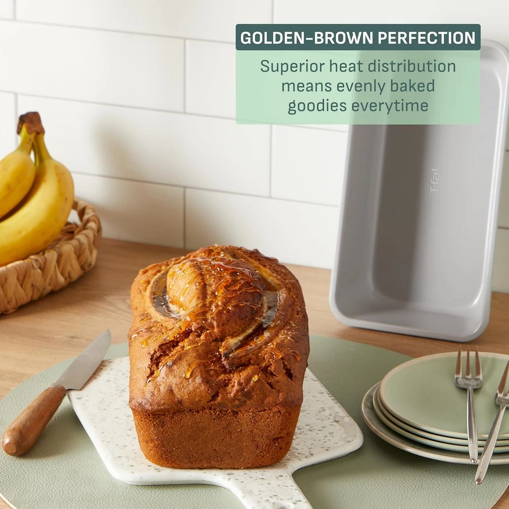 T-fal Refresh Ceramic Nonstick Baking Pans Set (8 pc), 8-Piece, Mint Green Product Details Material: Ceramic Color: Mint Green Brand: Tefal Size: 8-Piece Handle Material: Ceramic Is Dishwasher Safe: No Compatibility Options: Oven Number of Pieces: 8 Closure Material: Ceramic Included Components: 2 Loaf Pans, 1 12-Cup Muffin Tray, 1 Square Cake Pan, 2 Baking Sheets, 1 Cooling Rack, 1 Roaster Manufacturer: Groupe SEB Manufacture Year: 2025 Special Feature: Non Stick Item Weight: 10.03 Pounds Product Dimensions: 12.99 x 6.18 x 17.91 inches Item Weight: 10.03 pounds Country of Origin: China Item model number: J177S864 Designed to Stack: 8-piece baking set with a stackable all-in-one design that stacks neatly to save space and keep your kitchen organized. Includes a Roaster, Cooling Rack, two Cooki Sheets, two Loaf Pans, a Square Cake Pan and a 12-Cup Muffin Tray. Tough & Timeless: Crafted from ceramic non-stick, this set is durable, scratch-resistant and oven-safe up to 450°F—because great bakes deserve great tools. Smooth Release: Say goodbye to stuck-on messes! The smooth ceramic non-stick coating ensures effortless release, so your treats pop out perfectly every time. Golden-Brown Perfection: Superior heat distribution means evenly baked goodies with that just-right crisp and color. Quick Clean-Up: The smooth ceramic surface makes clean-up a total breeze. Less scrubbing, more baking! Introducing the 8 piece ceramic baking set, the perfect blend of space-saving design and premium performance. Whether you're a passionate baker or just starting out, this set makes a stylish yet practical addition to any kitchen. Its stackable design allows even the smallest kitchens to enjoy a full range of baking options without sacrificing space.