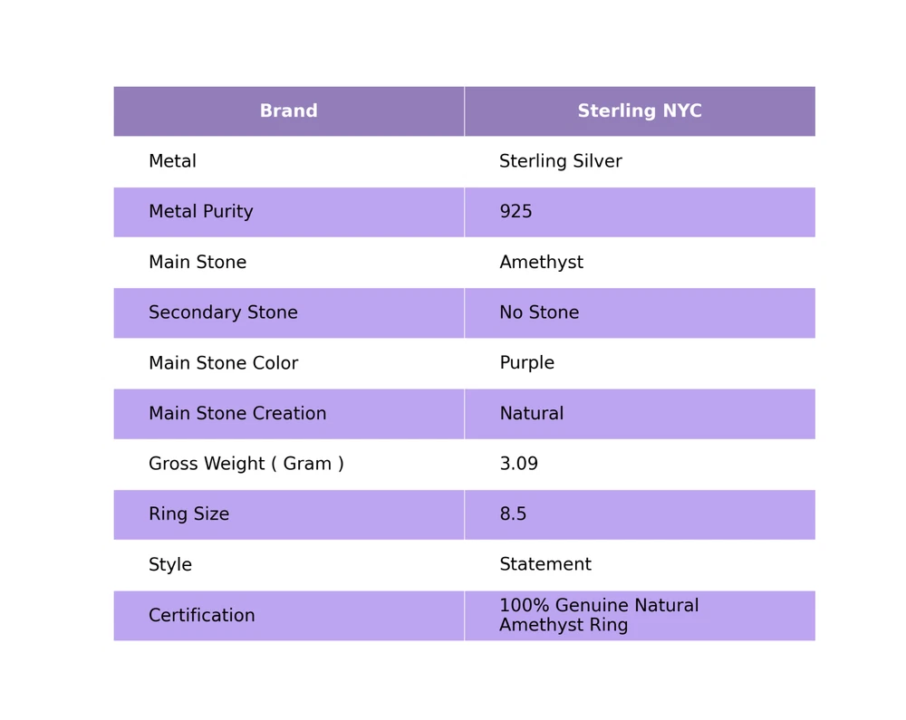 Welcome to Sterling NYC Gift For Women Statement Ring Size 8.5 925 Silver Natural Amethyst Gemstone Handmade Ring, Sterling Silver Ring, Amethyst Ring, Handcrafted Ring Specifications:- SKU : JS-57040 Gemstone : Amethyst Stone Shape : As Seen In Picture Metal Purity : 925 Sterling Silver Ring Size : 8.5 US Adjustable : ----------------------------------------------------------------------------------------------------- Experience the timeless allure of silver jewelry, a cherished choice known for its exceptional properties and countless rewards. Explore the captivating charm of its unique attributes, enveloping you with elegance and remarkable healing qualities. Immerse yourself in the enigmatic world of silver, where beauty and benefits harmoniously intertwine. Benefits: Embrace the Elegance : Silver jewelry seamlessly blends accessible luxury with timeless beauty, elevating any jewelry collection without the need for extravagant spending. A Mindful Companion : Adorn yourself with silver jewelry as a gentle nudge towards mindfulness, a tangible reminder to cherish the beauty of every moment. Amplify Positivity : Silver, known for its energy-conducting qualities, is thought to enhance the power of positive intentions and affirmations, aiding in the clear manifestation of your desires. Unleash Self-Expression : Silver jewelry, with its versatile designs, empowers individuals to express their unique style, allowing their personality to shine through every piece. Soothing Serenity : Silver's cooling properties are believed to have a therapeutic effect, bestowing a sense of relief and tranquility upon both body and mind. ----------------------------------------------------------------------------------------------------- For Mother's Day Gift For Father's Day Gift For Promise For Valentine' Day For Halloween Party For Christmas Day Gift For New Year Party For Mom For Her ----------------------------------------------------------------------------------------------------- Discover the impeccable designs tailored just for you, and receive personalized guidance by reaching out to us. Our skilled artisans meticulously handcraft each piece in our workshop, infusing them with love and unwavering attention to detail. Your visit holds immense significance to us, and we are committed to ensuring that your shopping experience is nothing short of exceptional. Thank you for choosing us; we sincerely hope you thoroughly enjoy your shopping journey. Happy shopping! ----------------------------------------------------------------------------------------------------- At SterlingNYC, exquisite craftsmanship meets premium sterling silver gemstone jewelry. Our handcrafted pieces reflect authenticity and uniqueness, a testament to our commitment to excellence. Explore our collection and create your own dazzling jewelry ensemble.