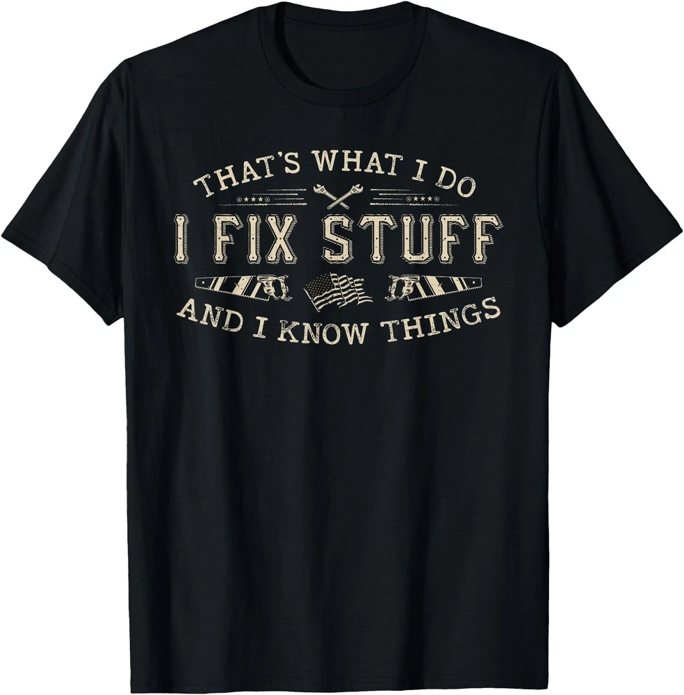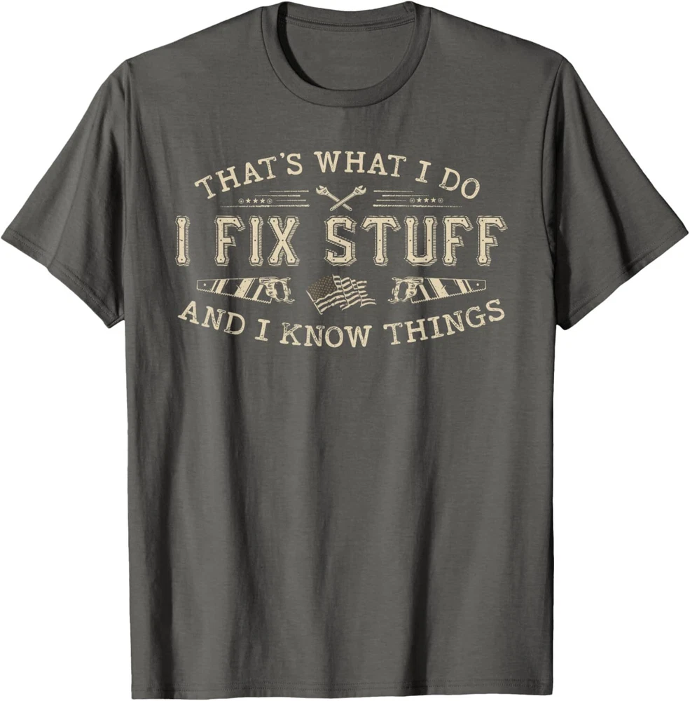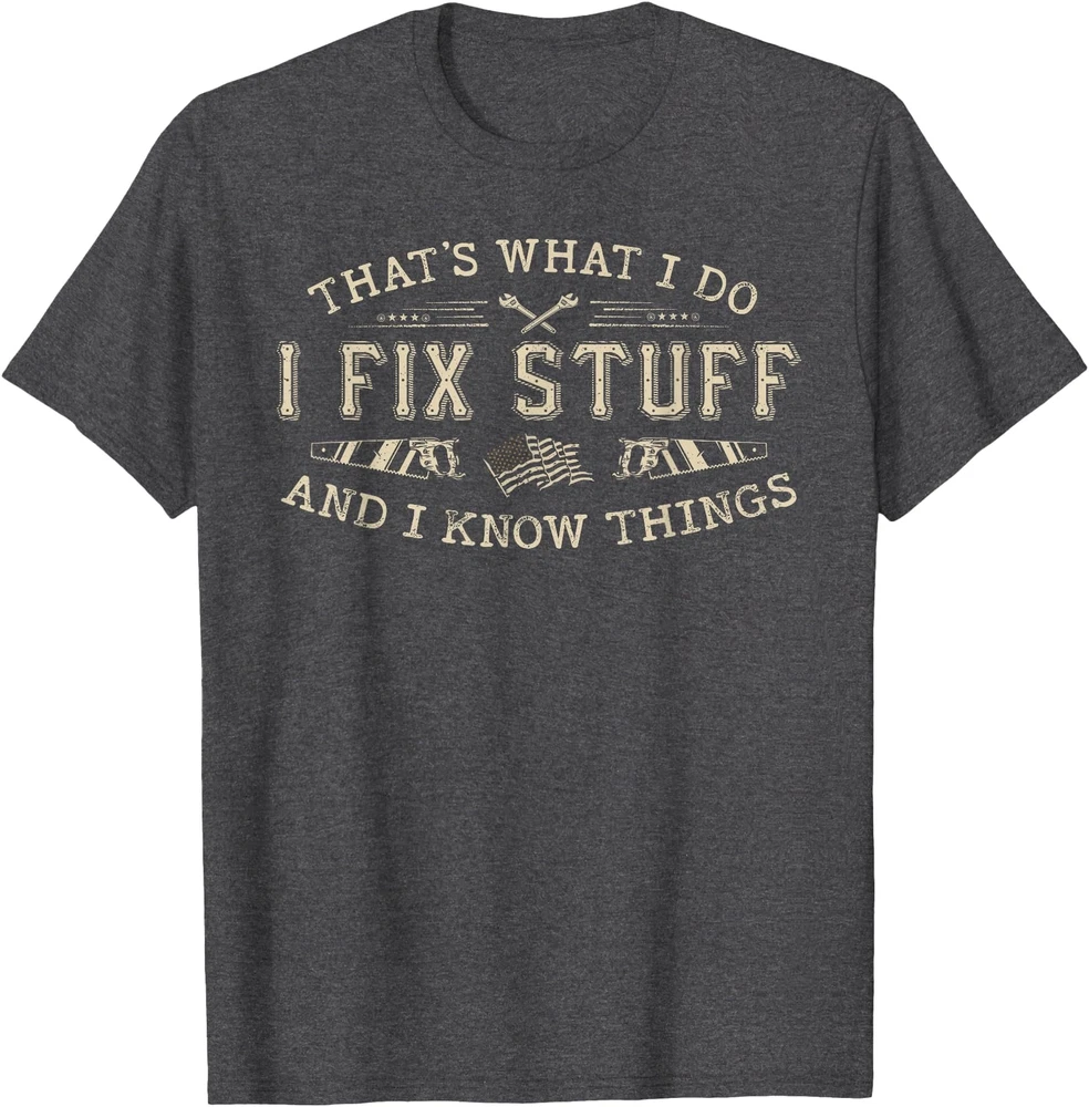 That's What I Do I Fix Stuff And I Know Things Funny Men Dad T-Shirt Designed and Printed in USA Product Features: • Classic Look and Feel: This ultra cotton tee offer the timeless appeal of traditional cotton. The high-quality print enhances its casual appearance. • Material: Made from 6.1-ounce, 100% cotton. (Note: Dark Heather variant is 50% cotton, 50% polyester.) • Durability: Features double-needle stitching on the neck, sleeves, and hem for added durability. Designed for a roomy, unisex fit. • Print Type: DTG (Direct to Garment) • Manufacturer: Gildan 5000, 5000b (Made in USA) Shipping Information: • Handling Time: With POD(Print-On-Demand) product model, we typically require about 3 business-days handling time before shipping. In most cases, our handling time’s , rang e from 1-2 business days. • Delivery Time: • USA: Approximately 2 -6 business days • Canada: Approximately 6-10 business days (We currently don’t offer international Shipping) • Worldwide: Approximately 15-25 business days (We Currently don’t offer international Shipping) • Shipping Carriers: USPS and DHL • Note: Business days exclude weekends and holidays. Return & Exchange Policy: • Quality Guarantee: We stand behind the quality of our products and workmanship . Any defects or errors on our part must result in a refund/ replacement at no charge. • Conditions for Returns: Returns are generally not accepted for user errors such as incorrect selection of sizes, designs, or colors. Returns /Replacements are acceptable for damages such as poor printing results, incorrect size or design caused by us. • Note: Please reach out to us if there are any questions or issue s with your item, we’ll do our best to resolve any issue you might have. Note: • We’re glad to have your support! If you have a moment, y our honest feedback is very valuable to us. Thank you!