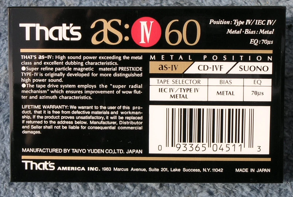 Thats branded cassettes. These are metal type IV cassettes and are audiophile quality with very high quality shells. "Thats" is the name brand that Taiyo Yuden used to market their own cassettes.Taiyo Yuden is still in business and makes magnetic media for industrial products. They no longer make recording tape. We used these tapes as customer copy tapes for our classical recording business for many years. We tried using many other brands and the Thats tapes were the most reliable ones we could get. We only had one failure of a Thats brand tape out of many hundreds of tapes recorded. C-60 cassette tapes are made with thicker tape backing stock and are much more reliable than C-90 and longer tapes. We used Nakamichi MR-1 tape decks. Be sure your recorder can use these tapes. The cassette decks sold today can not properly record these tapes due to the tape heads not being capable of supplying the magnetic flux to record at high levels.